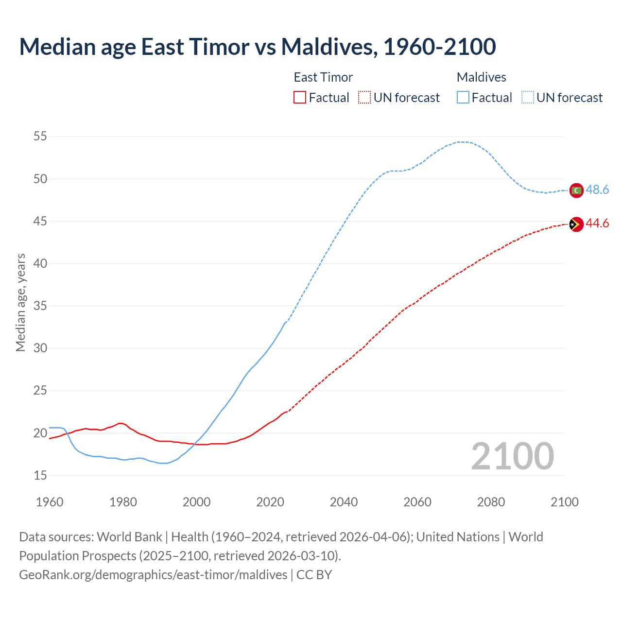 Median age East Timor vs Maldives, 1960-2100