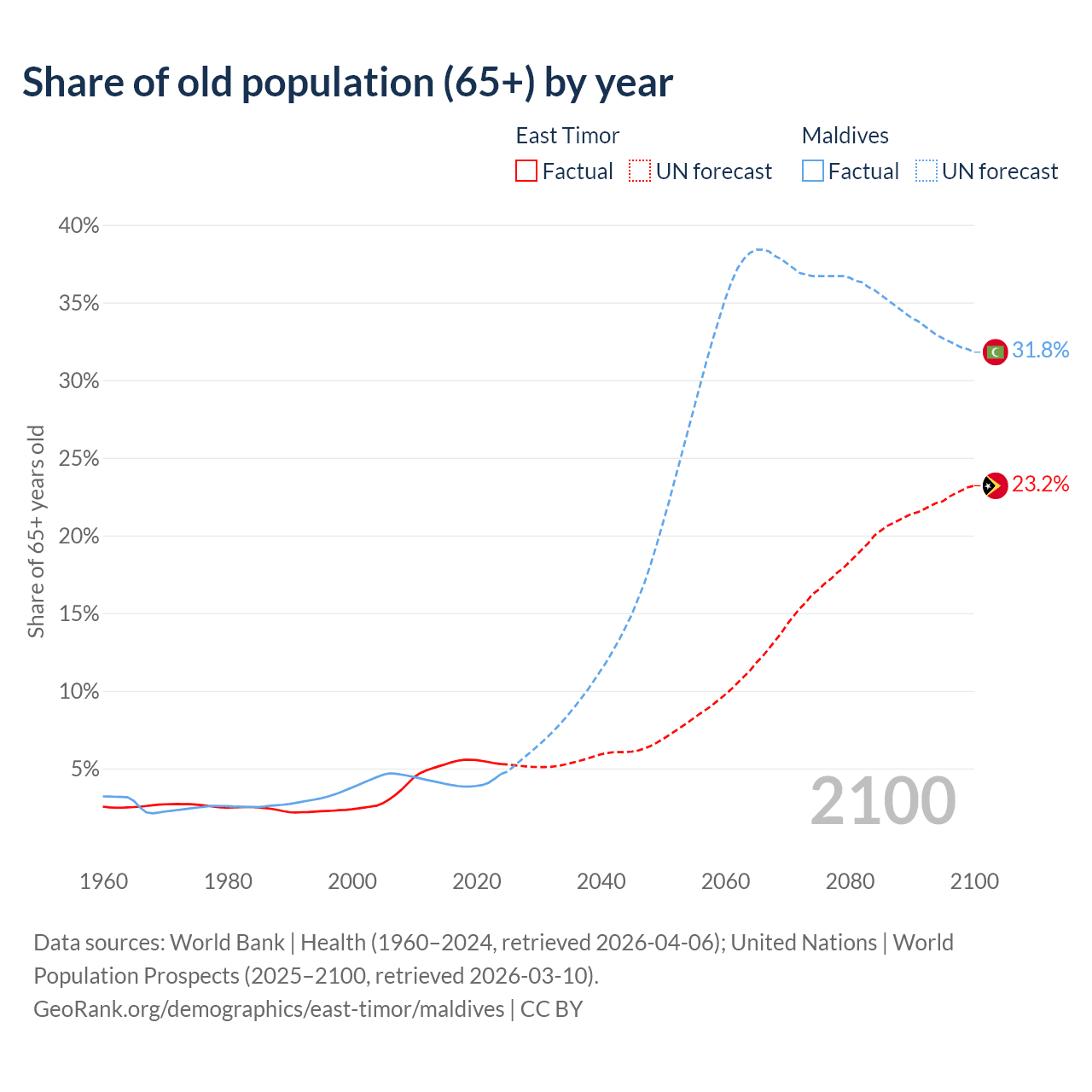 - The share of old-age demographic (65+) in East Timor is 5.28% vs 4.64% in Maldives.