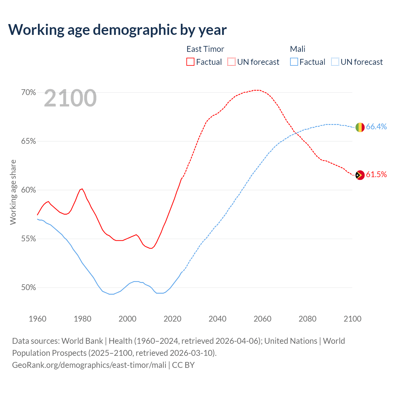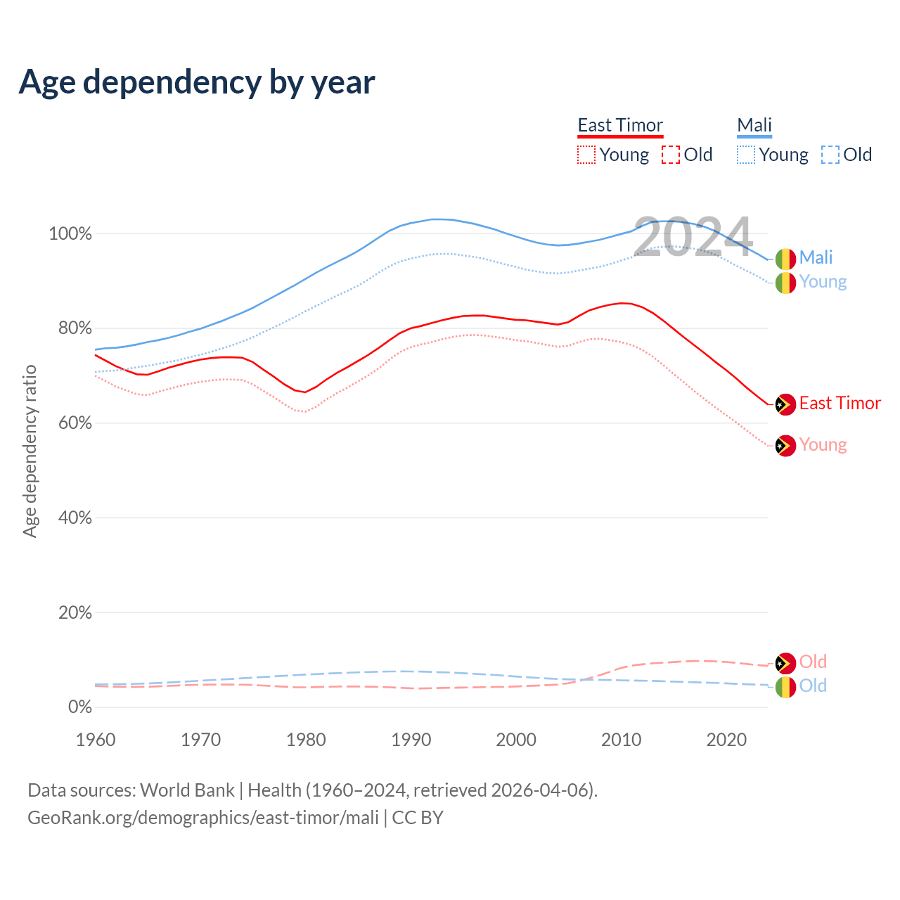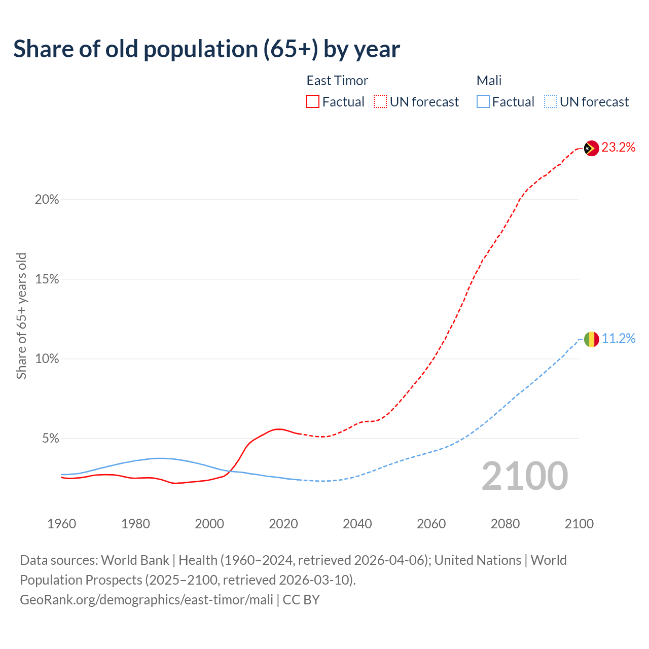 - The share of old-age demographic (65+) in East Timor is 5.28% vs 2.38% in Mali.