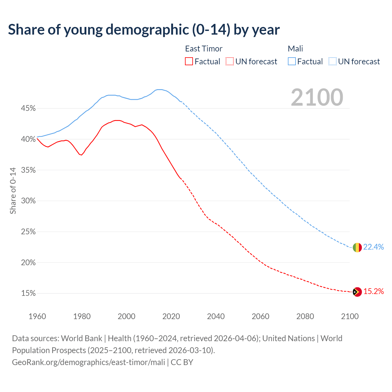 - The share of young demographic (0-15 years old) in East Timor is 33.7% vs 46.1% in Mali.