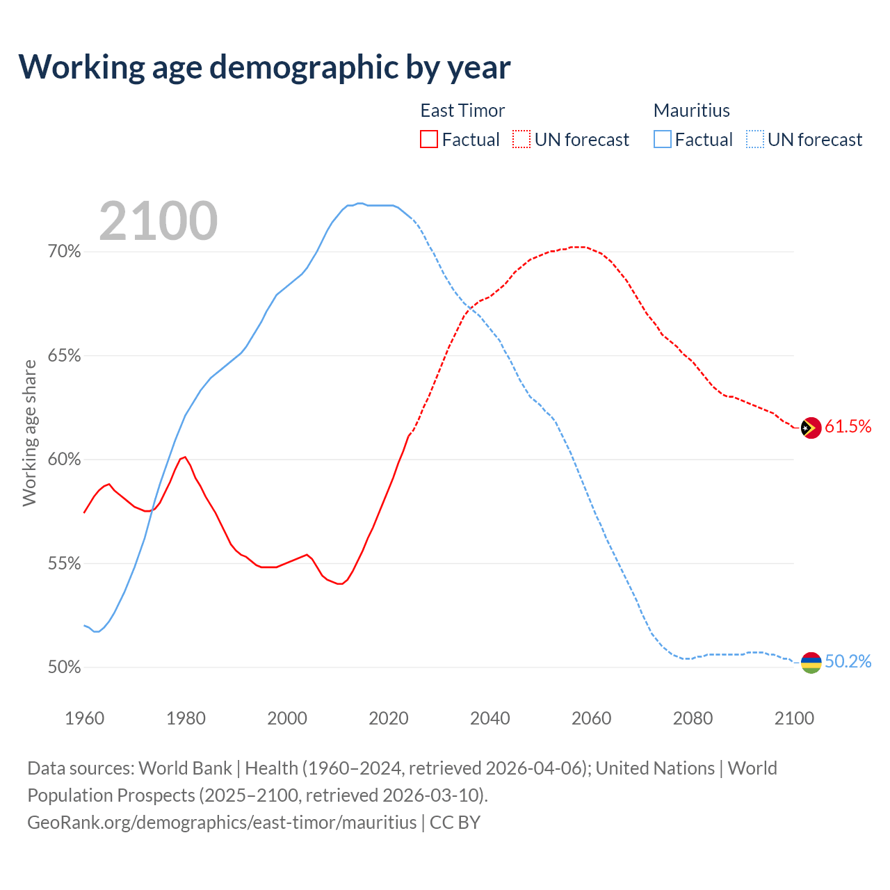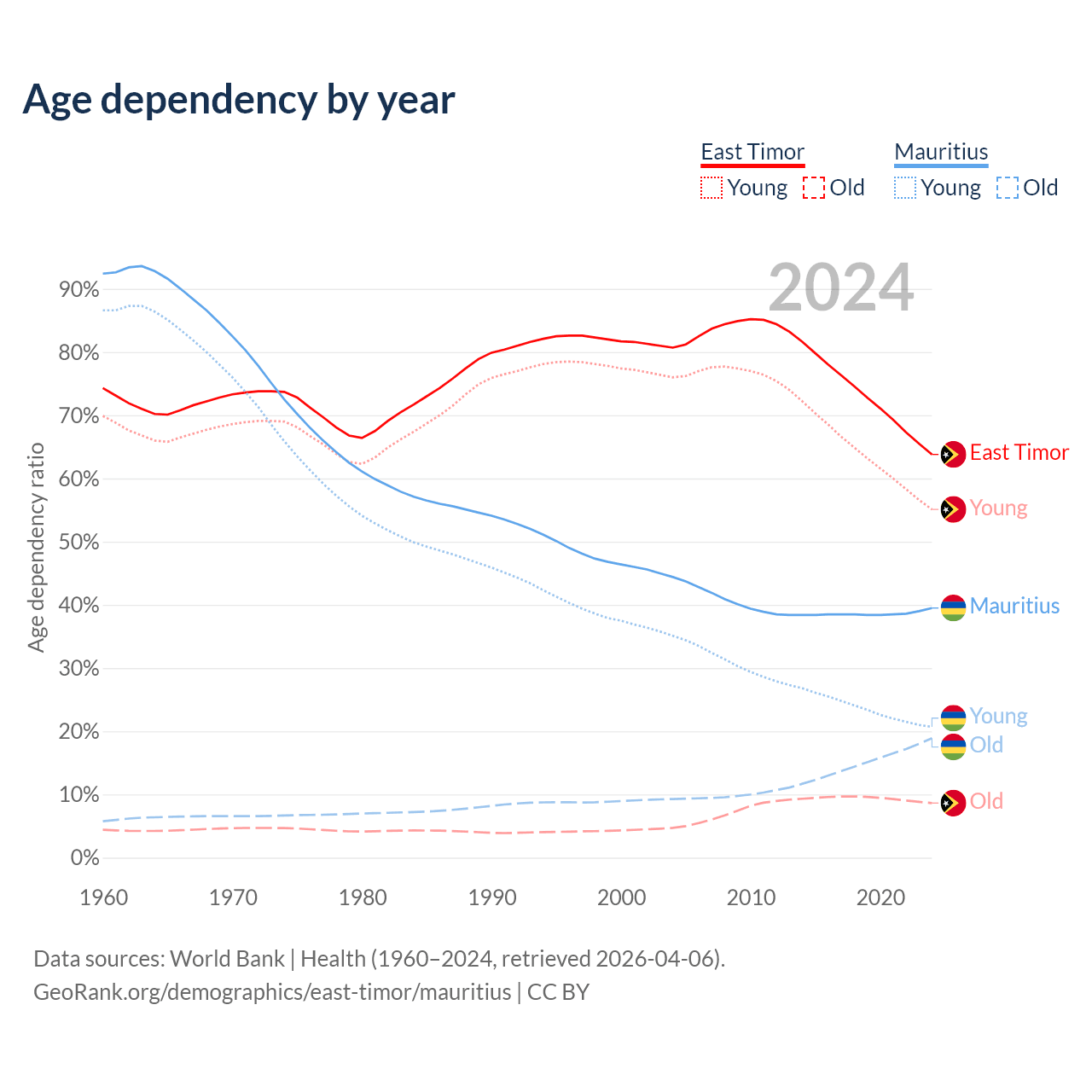 - The share of old-age demographic (65+) in East Timor is 5.28% vs 13.5% in Mauritius.
