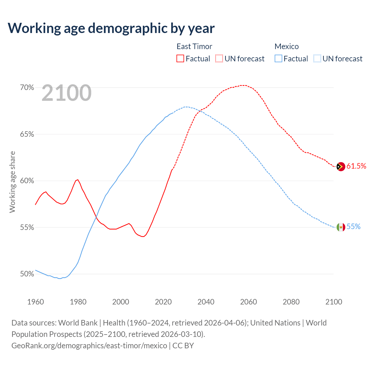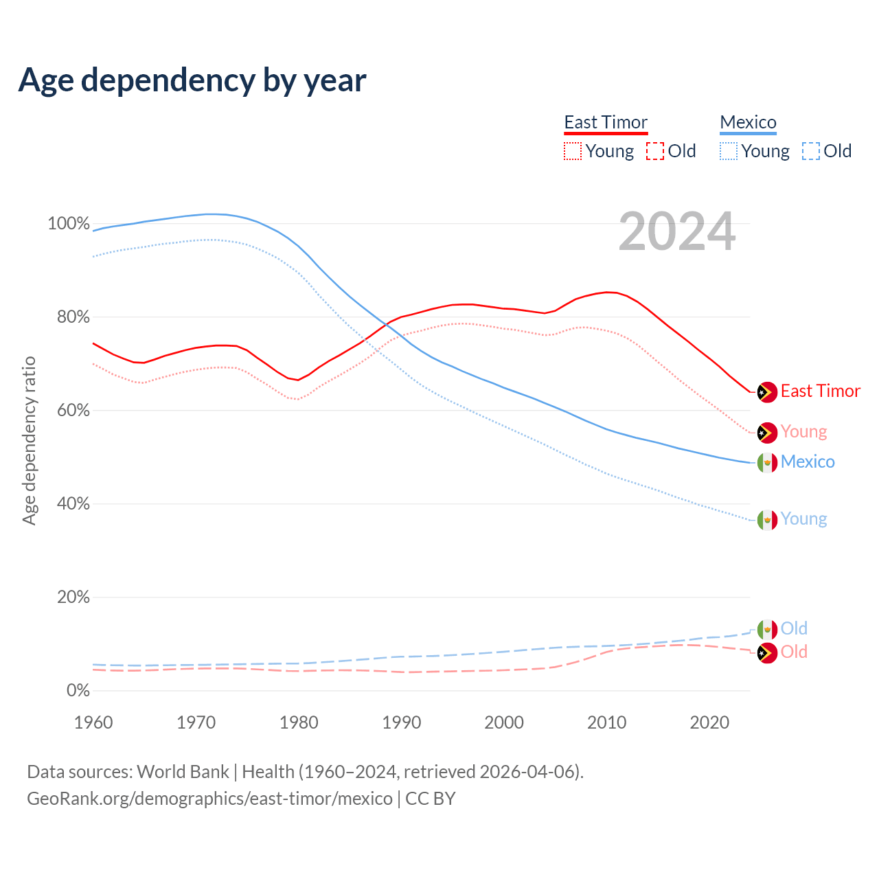 - The share of old-age demographic (65+) in East Timor is 5.28% vs 8.25% in Mexico.
