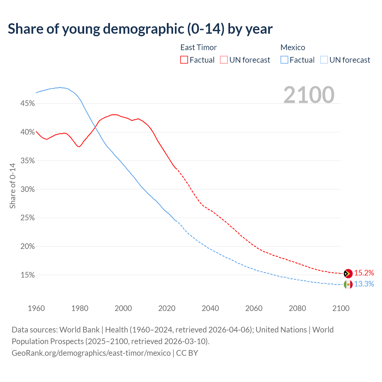 - The share of young demographic (0-15 years old) in East Timor is 33.7% vs 24.5% in Mexico.