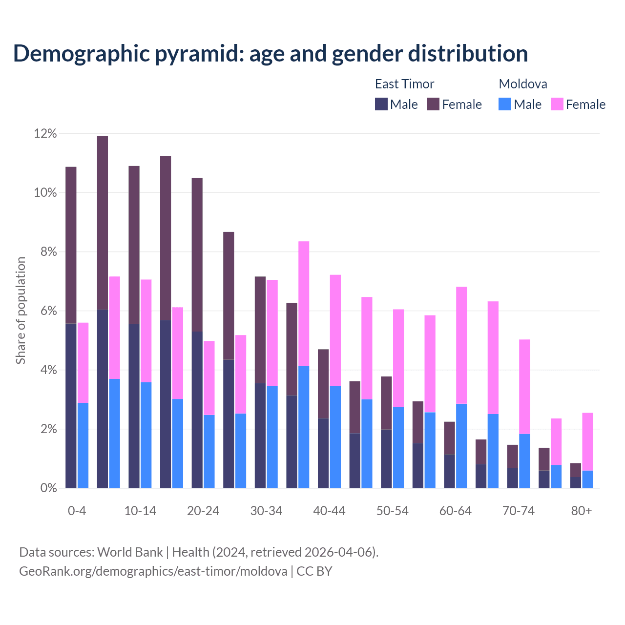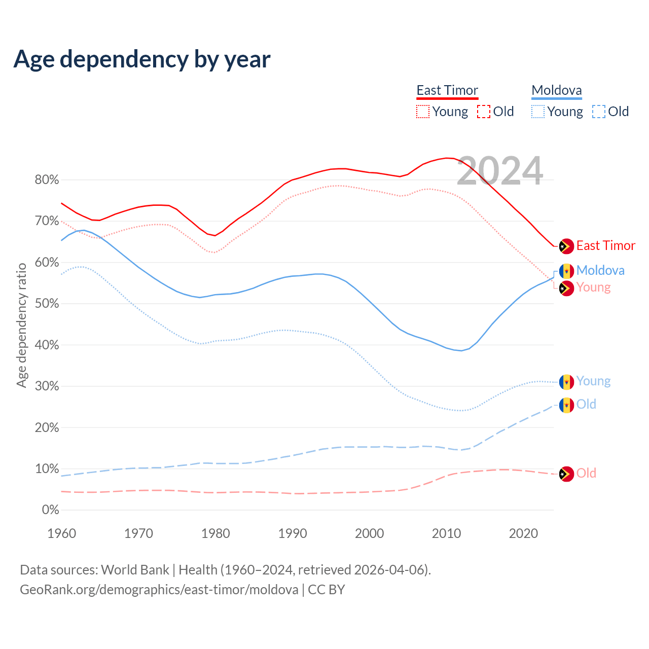 - The share of old-age demographic (65+) in East Timor is 5.28% vs 16.2% in Moldova.