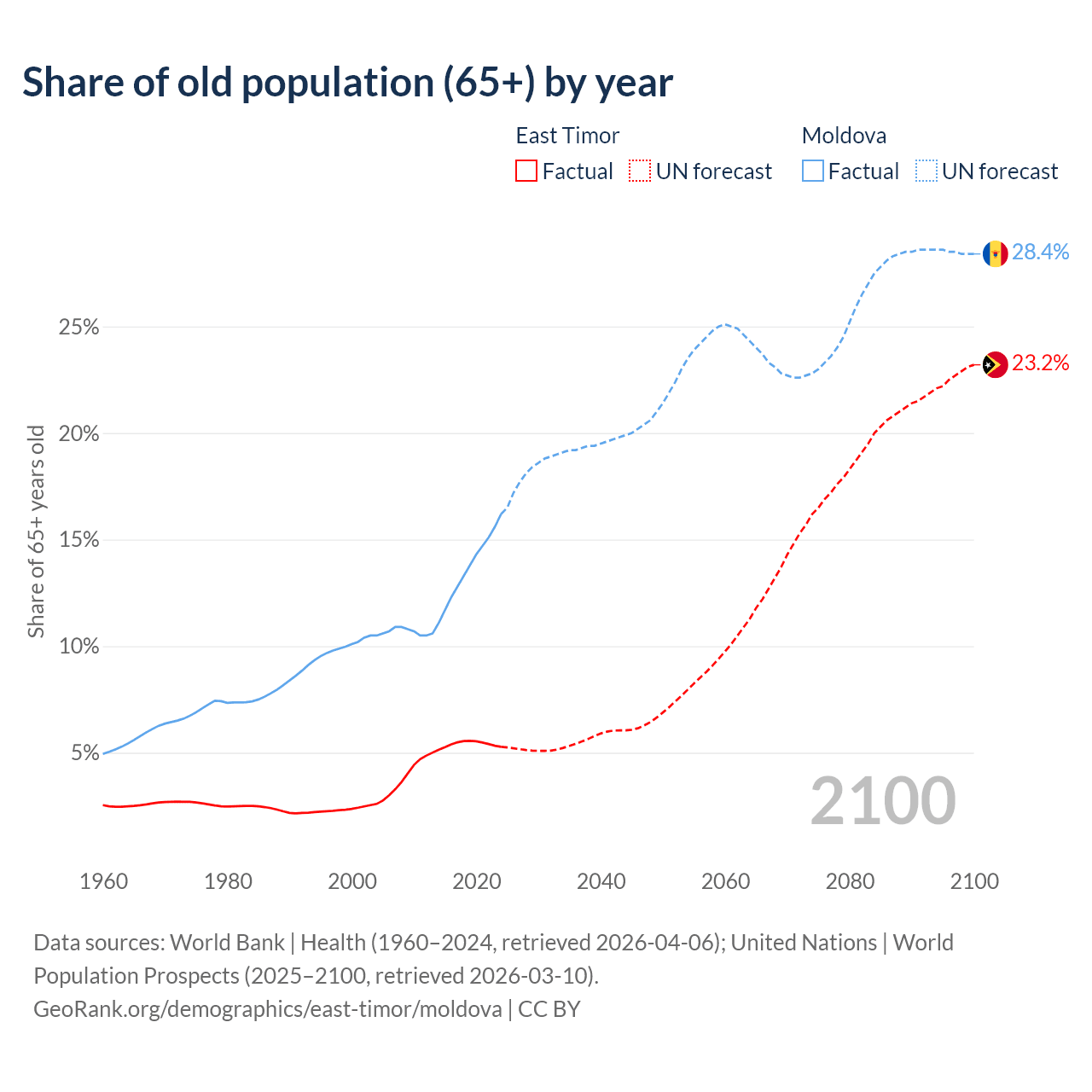 The share of older people aged 65 and over is 5.28% in East Timor and 16.2% in Moldova. Life expectancy in East Timor compared to Moldova .
