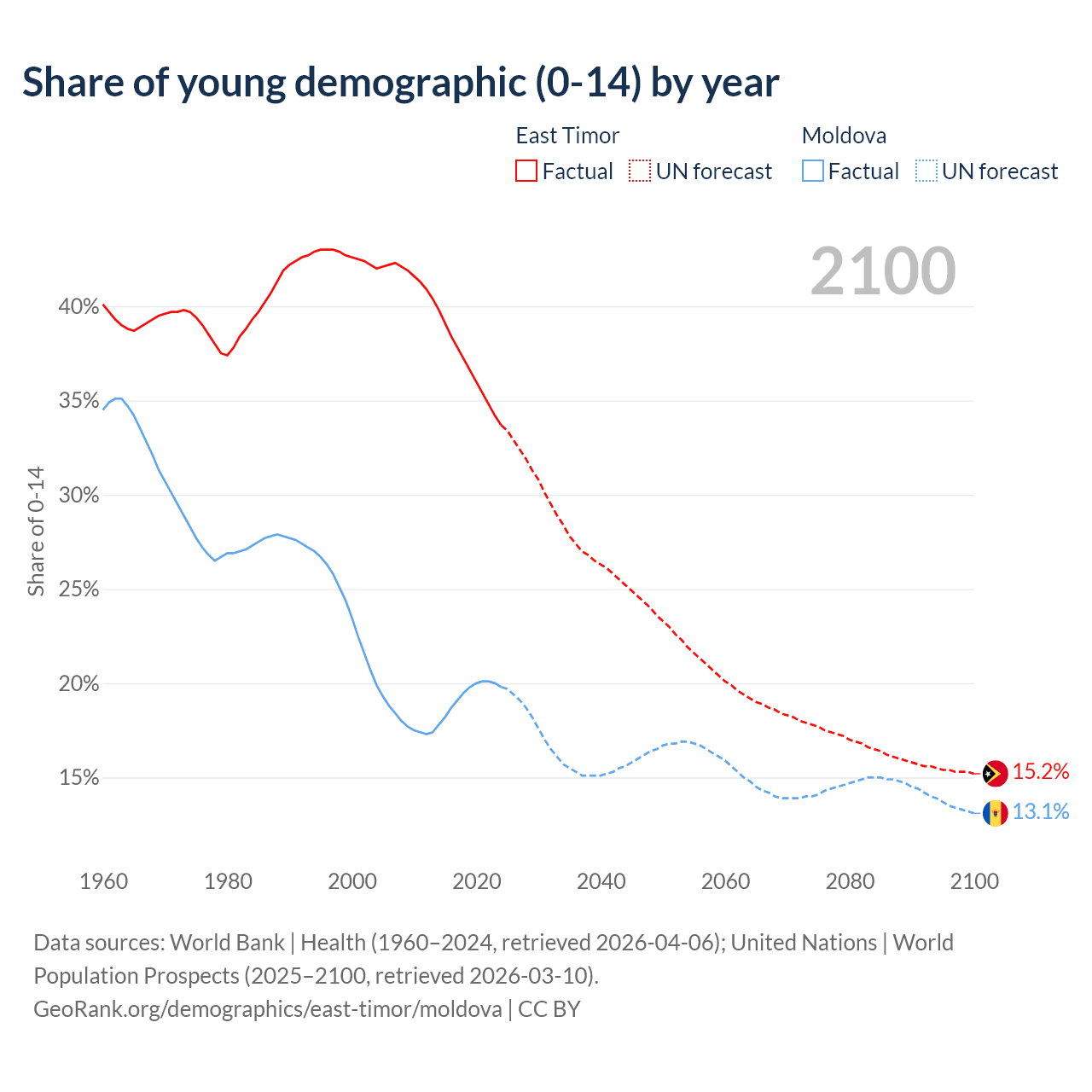 - The share of young demographic (0-15 years old) in East Timor is 33.7% vs 19.8% in Moldova.