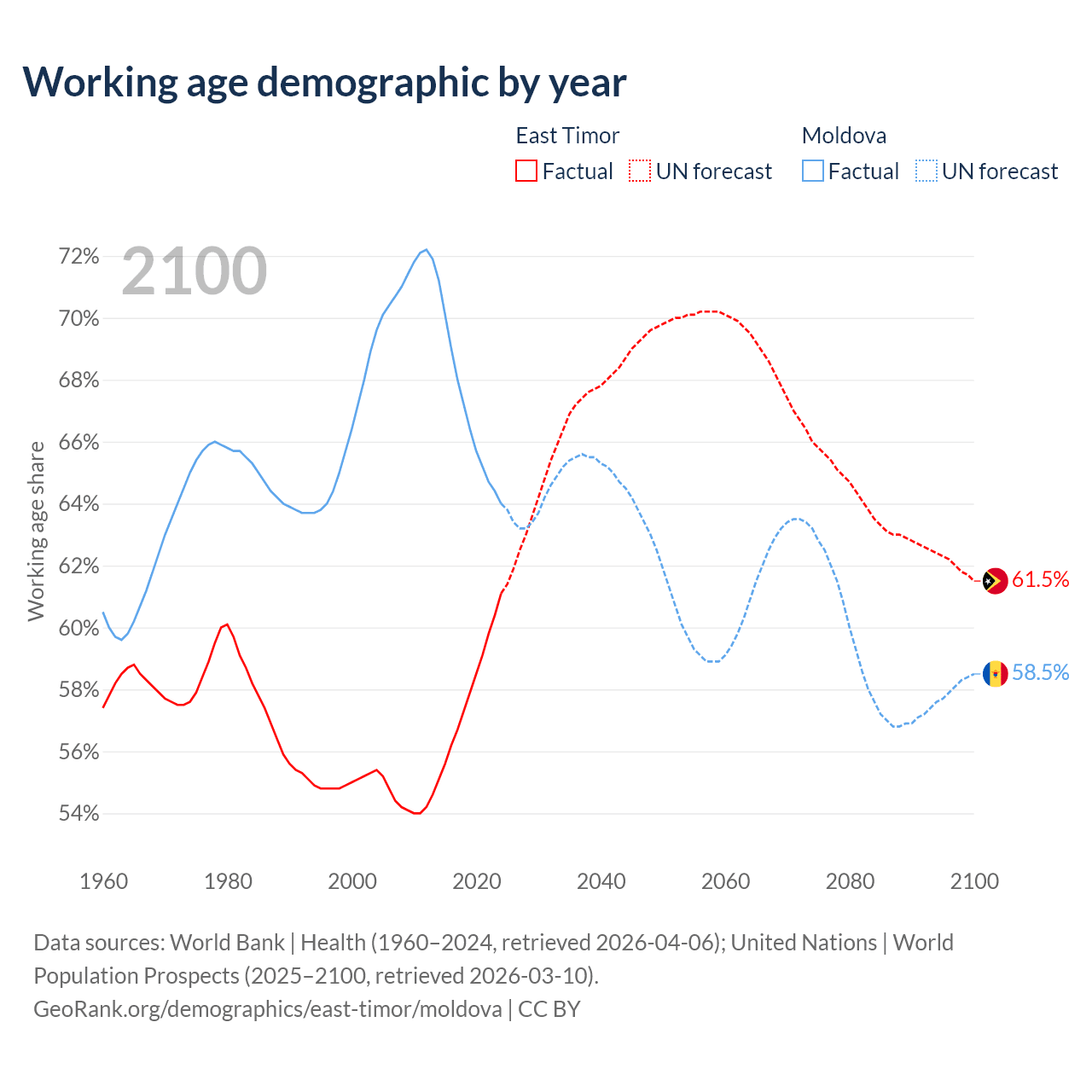 - East Timor has 880K working age adults (aged 15-64) vs 1.5M in Moldova.