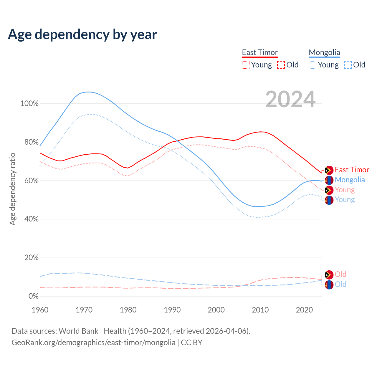 - The share of old-age demographic (65+) in East Timor is 5.28% vs 5.14% in Mongolia.