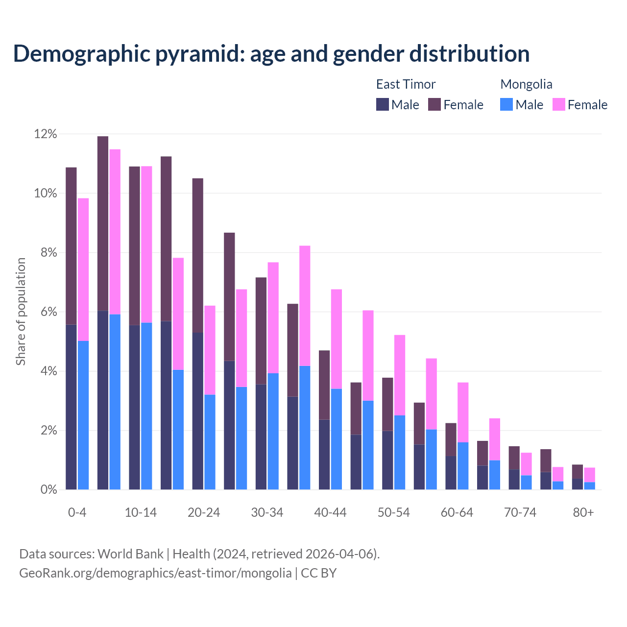 - As of 2026, the population of East Timor is 1.44M vs 3.62M in Mongolia - 2.51 times difference.