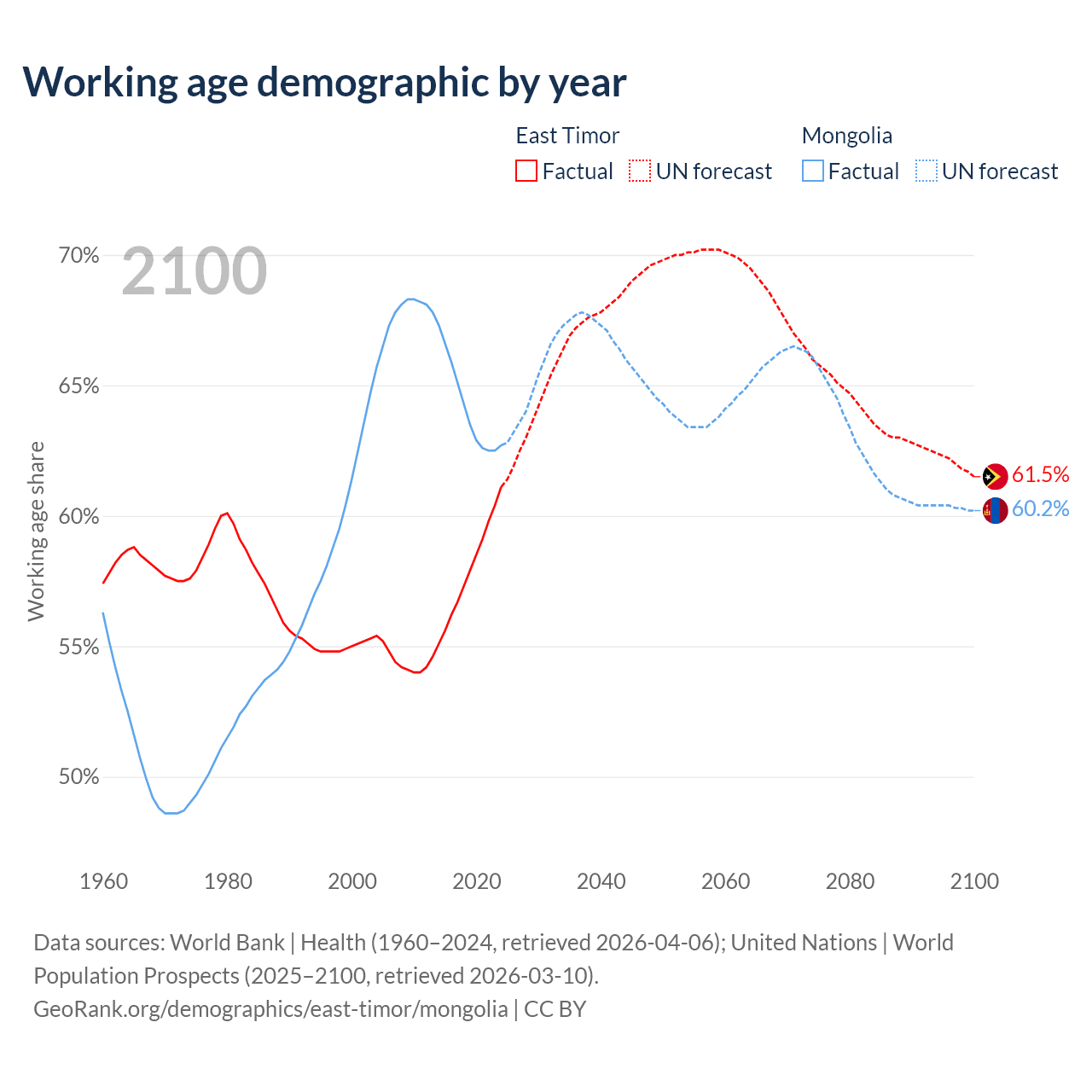 - East Timor has 880K working age adults (aged 15-64) vs 2.27M in Mongolia.