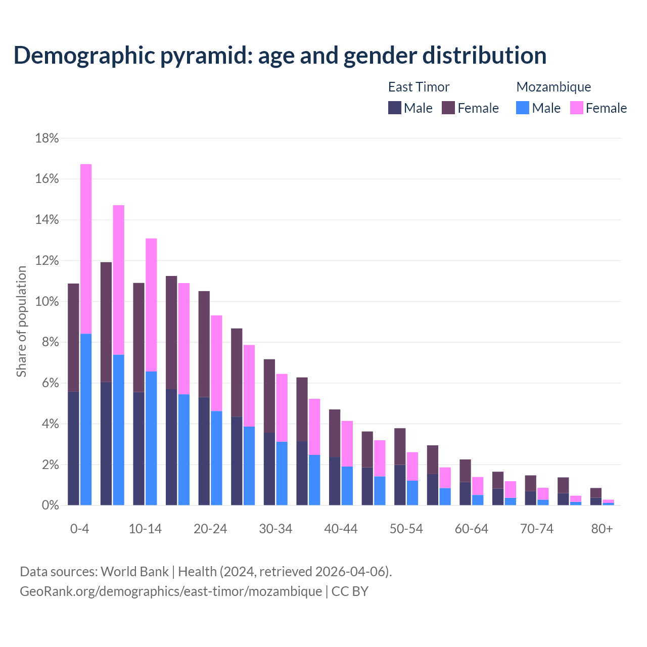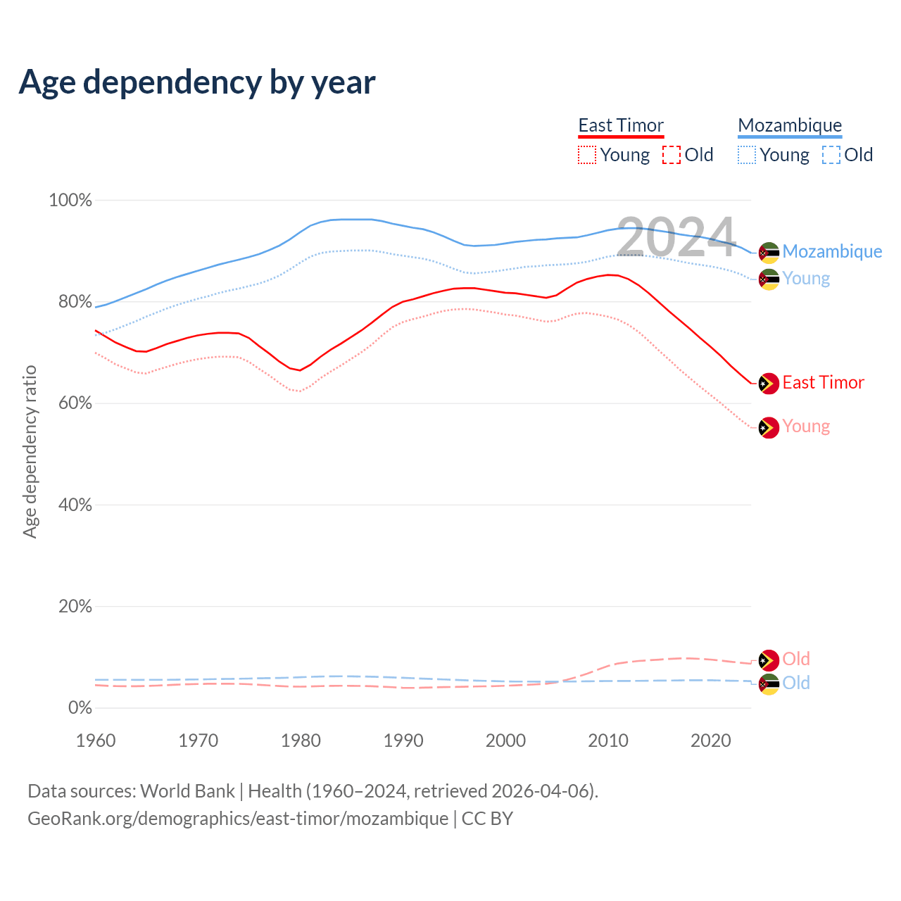 - East Timor is ranked 145/196 by median age (oldest to youngest) vs 189/196 for Mozambique.
