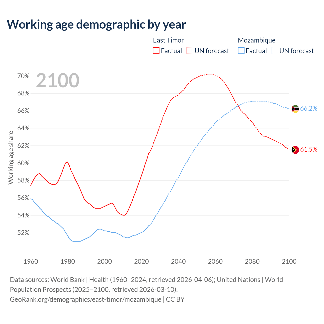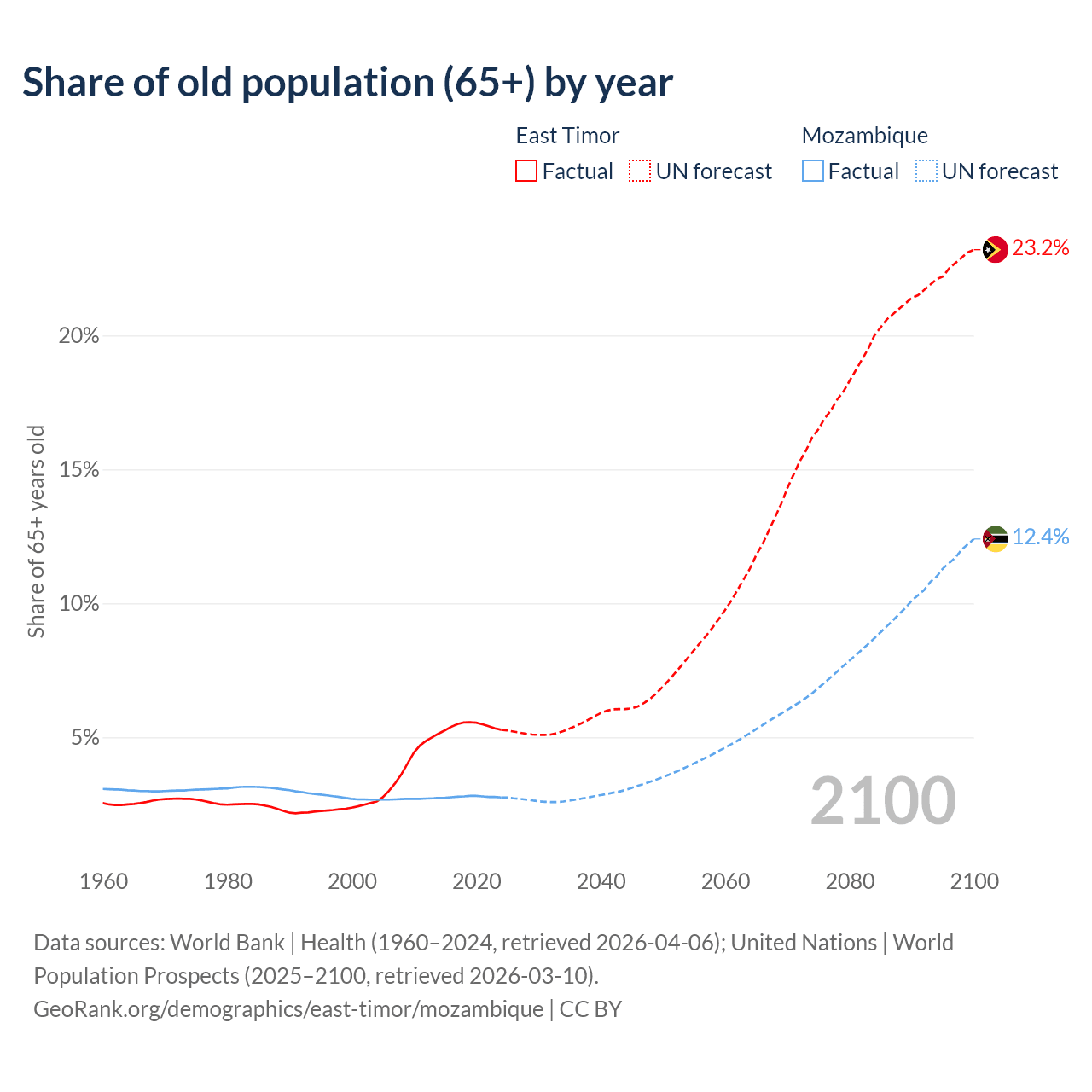 - The share of old-age demographic (65+) in East Timor is 5.28% vs 2.75% in Mozambique.