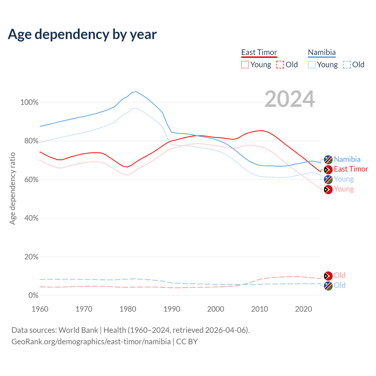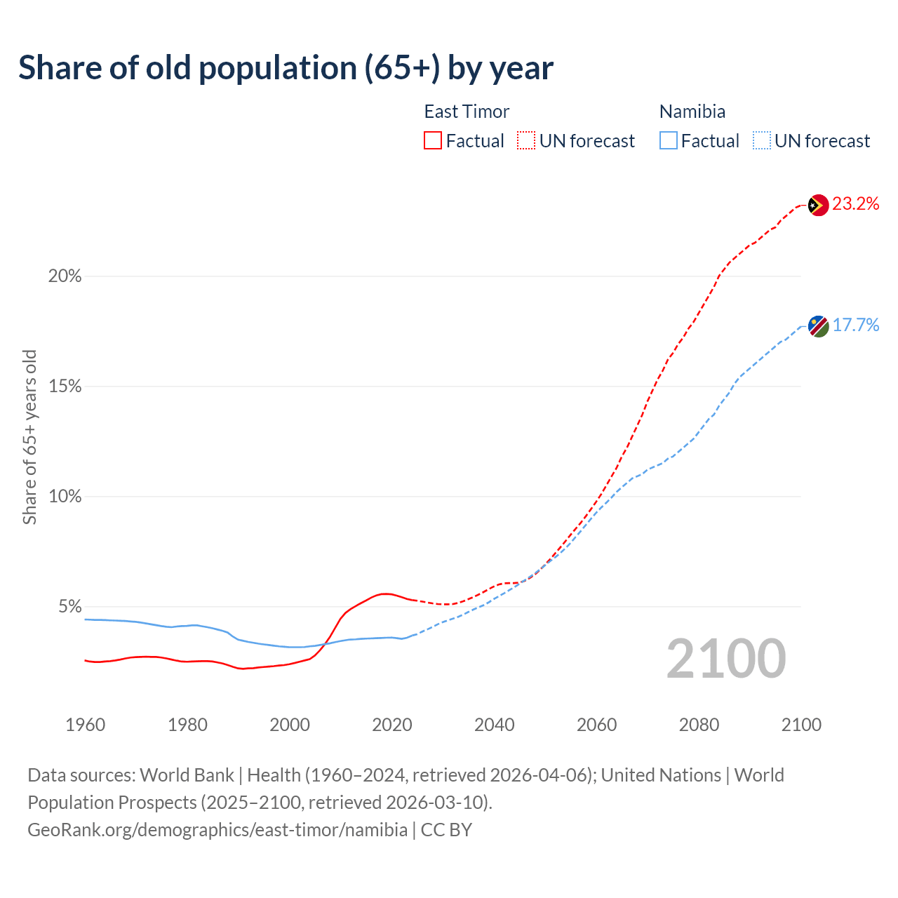 - The share of old-age demographic (65+) in East Timor is 5.28% vs 3.67% in Namibia.