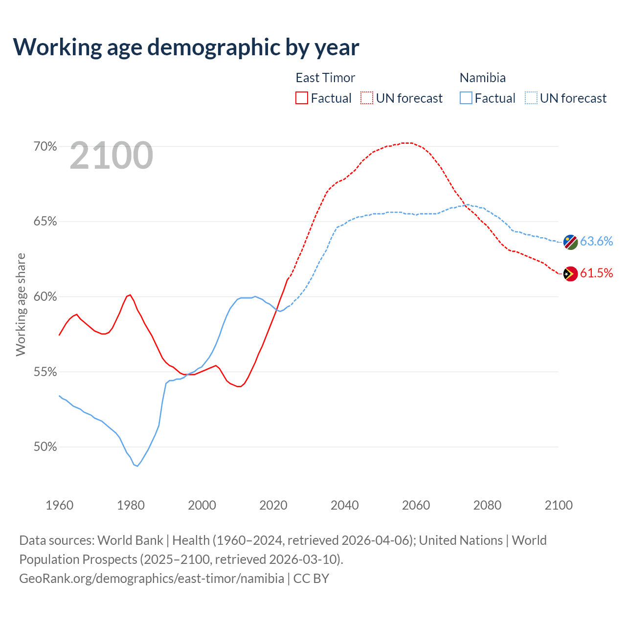 Median age East Timor vs Namibia, 1960-2100