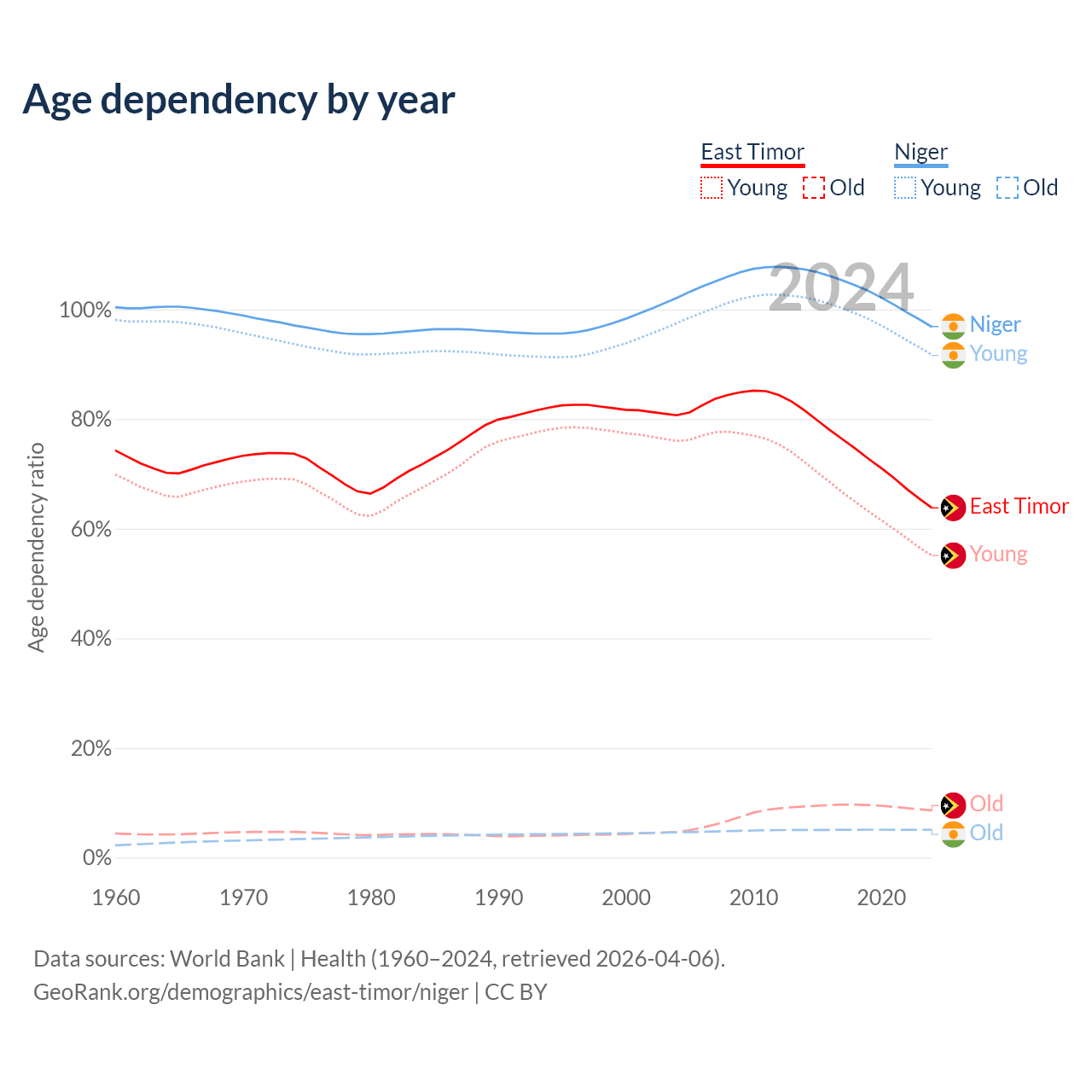 - The share of old-age demographic (65+) in East Timor is 5.28% vs 2.59% in Niger.