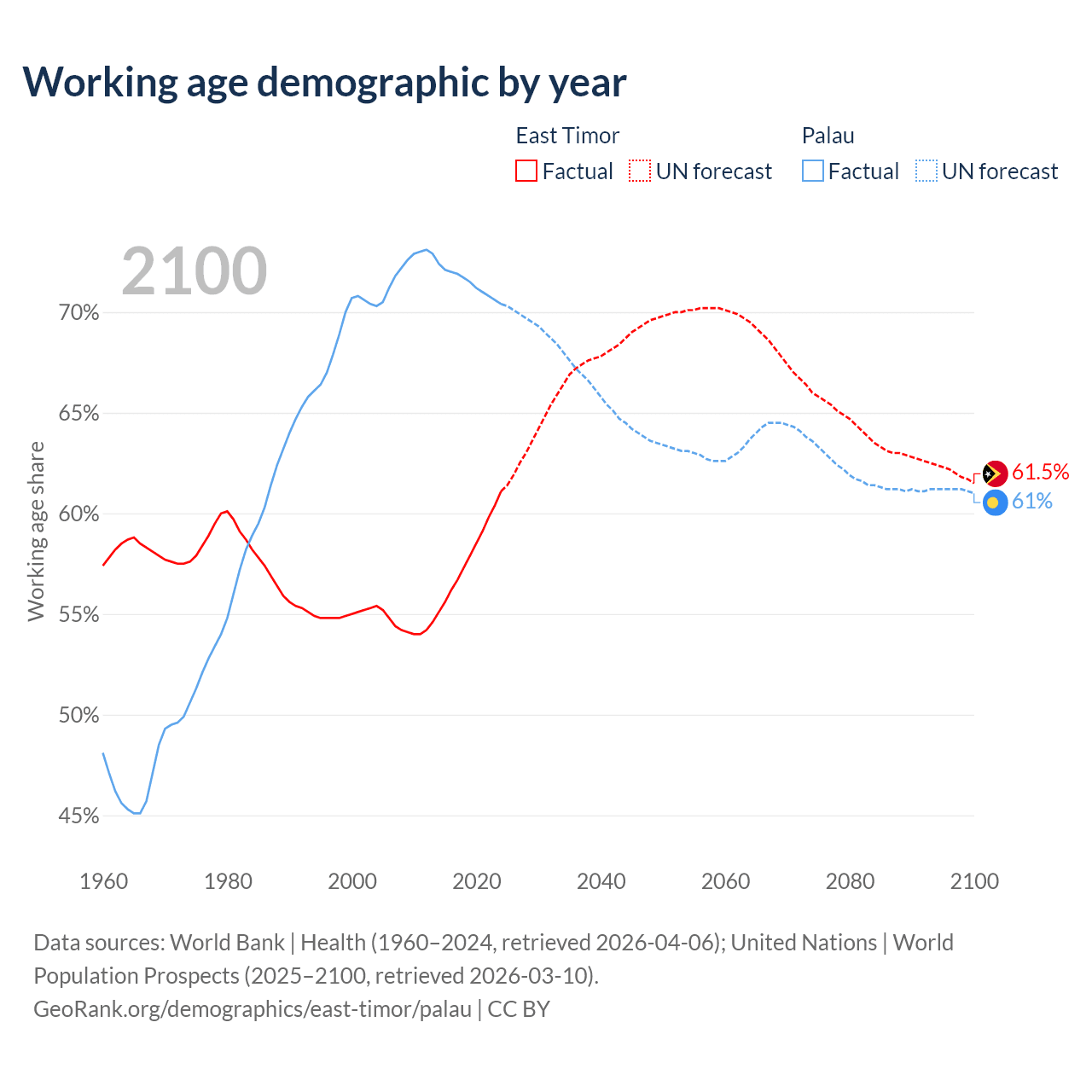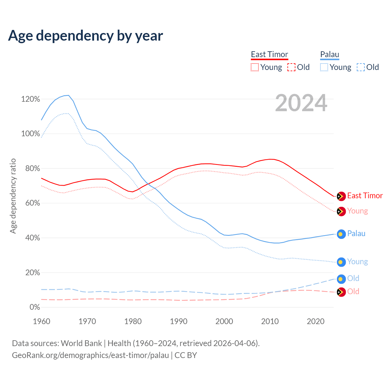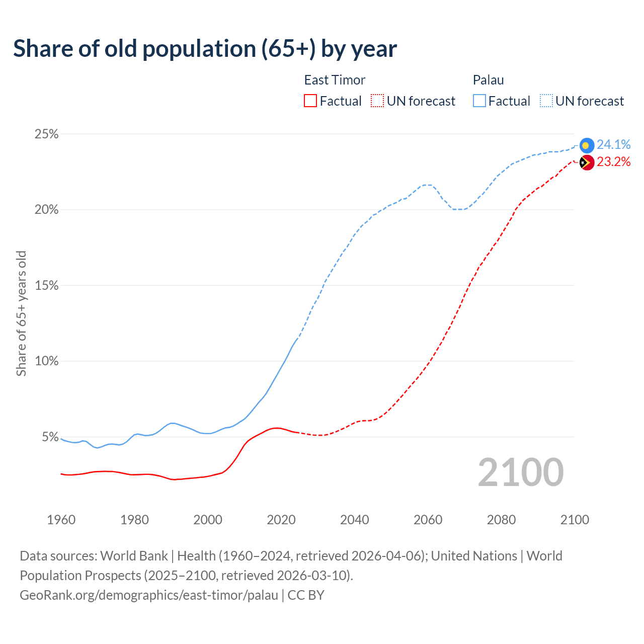 - The share of old-age demographic (65+) in East Timor is 5.28% vs 11.3% in Palau.