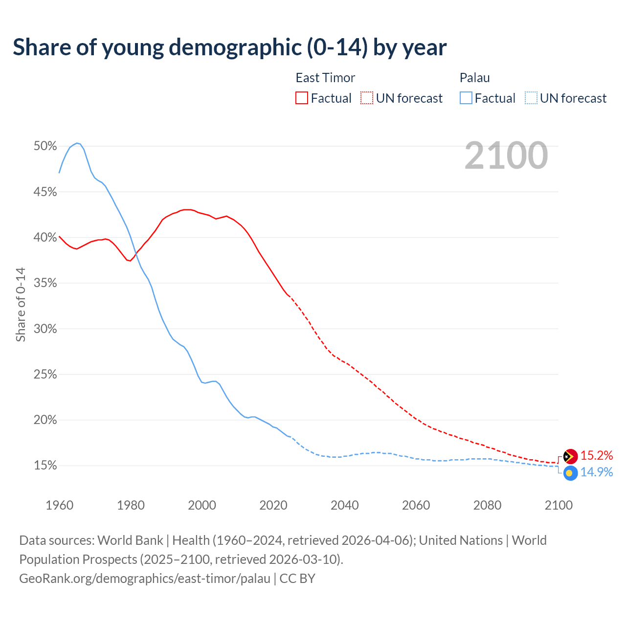 - The share of young demographic (0-15 years old) in East Timor is 33.7% vs 18.2% in Palau.