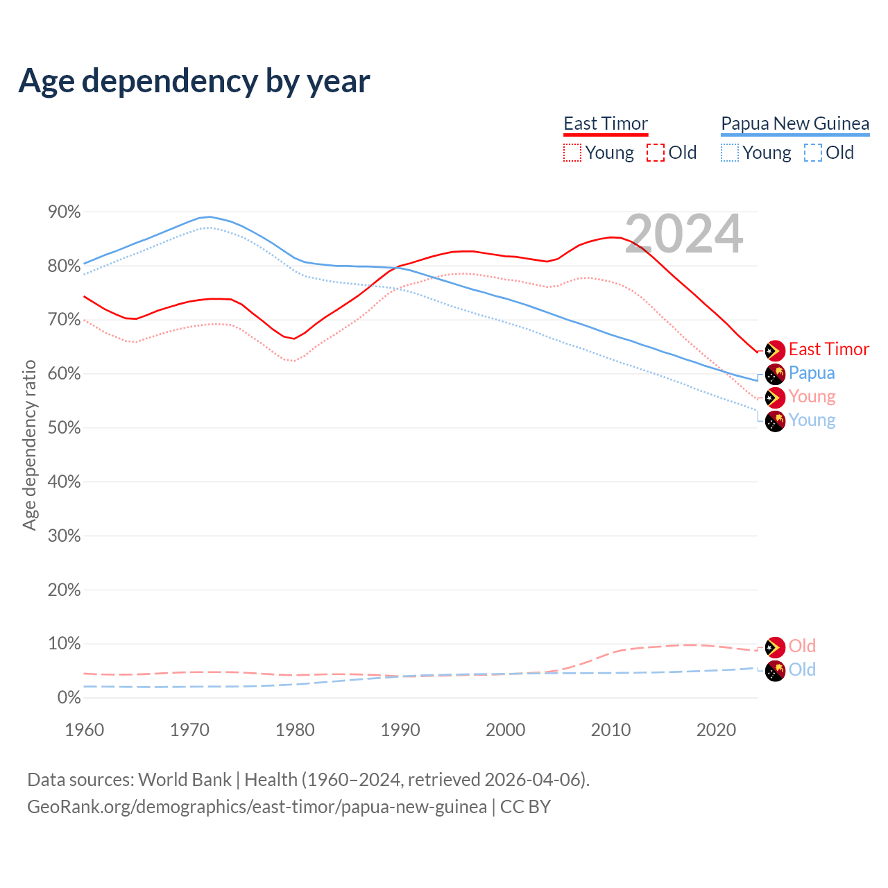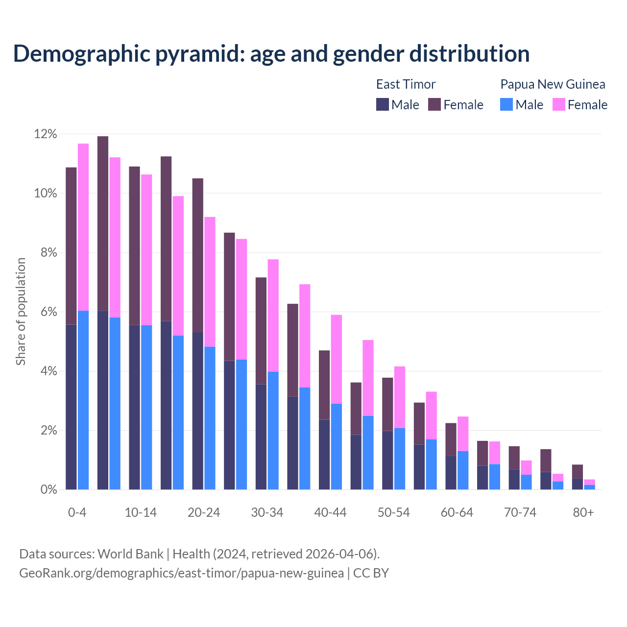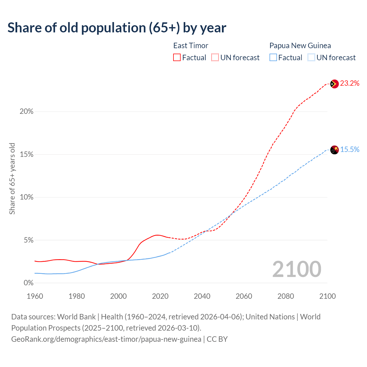 - The share of old-age demographic (65+) in East Timor is 5.28% vs 3.46% in Papua New Guinea.