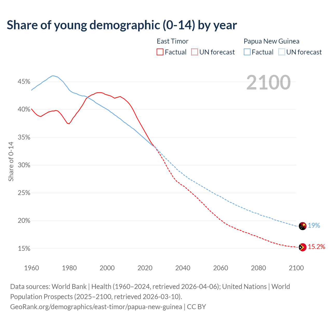 - The share of young demographic (0-15 years old) in East Timor is 33.7% vs 33.5% in Papua New Guinea.