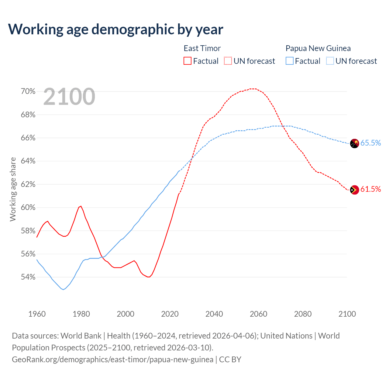 The share of older people aged 65 and over is 5.28% in East Timor and 3.46% in Papua New Guinea. Life expectancy in East Timor compared to Papua New Guinea .