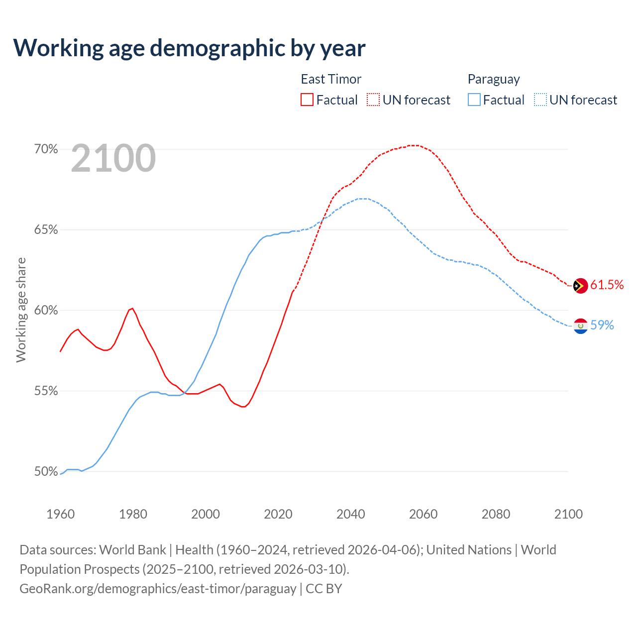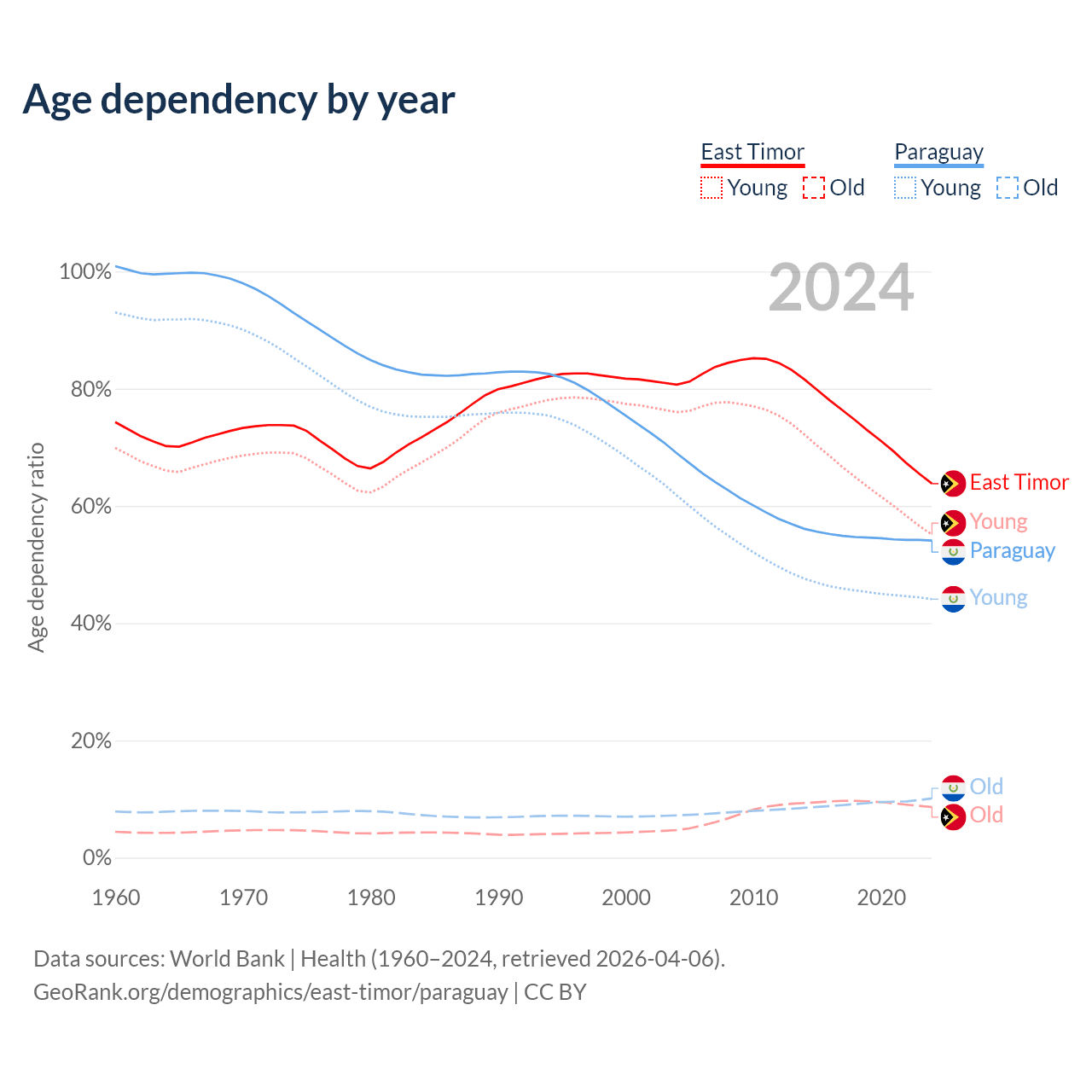 - The share of old-age demographic (65+) in East Timor is 5.28% vs 6.54% in Paraguay.