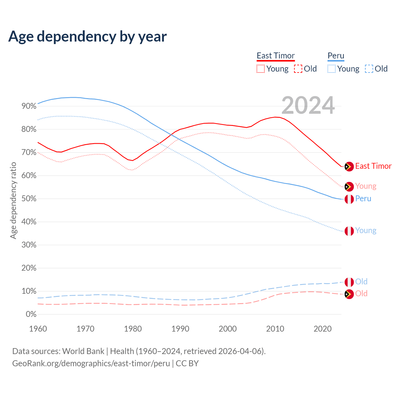 - The share of old-age demographic (65+) in East Timor is 5.28% vs 9.23% in Peru.