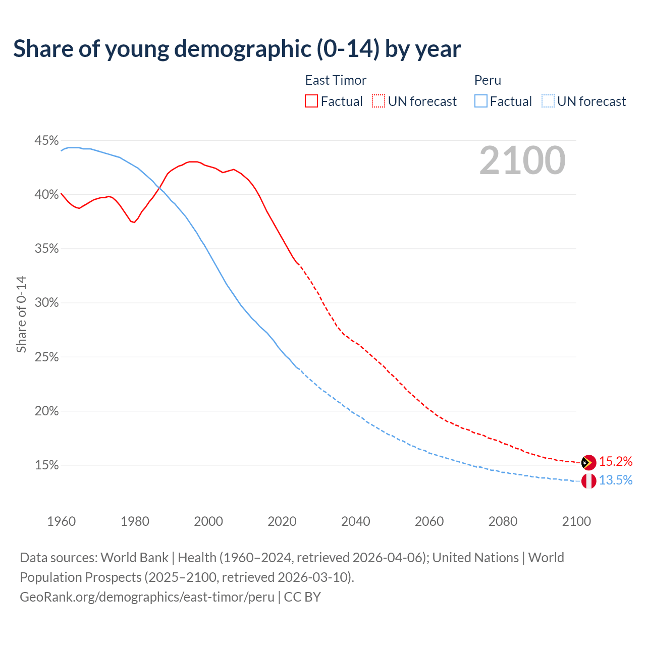 - The share of young demographic (0-15 years old) in East Timor is 33.7% vs 24% in Peru.