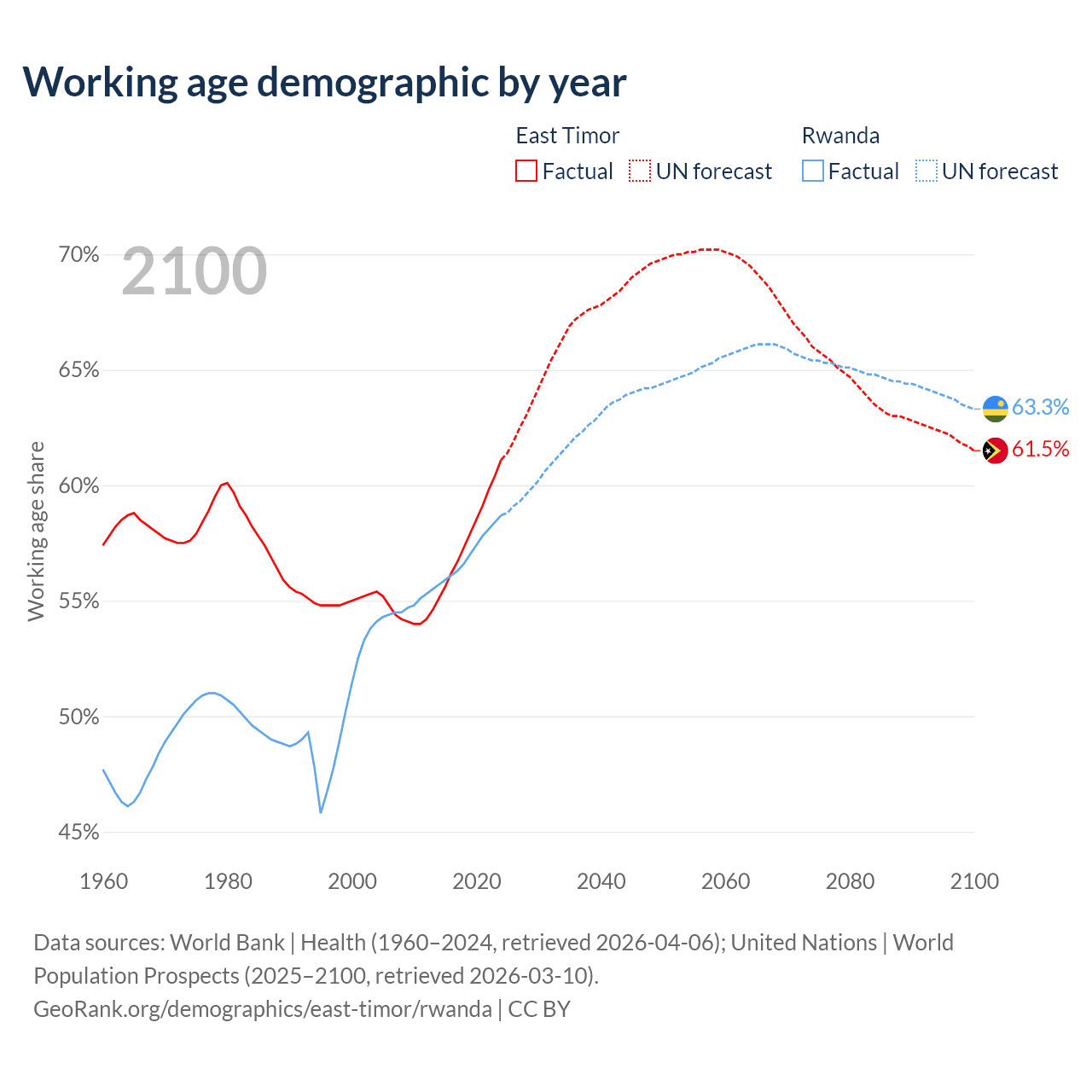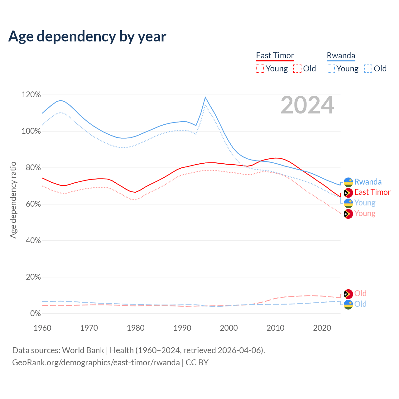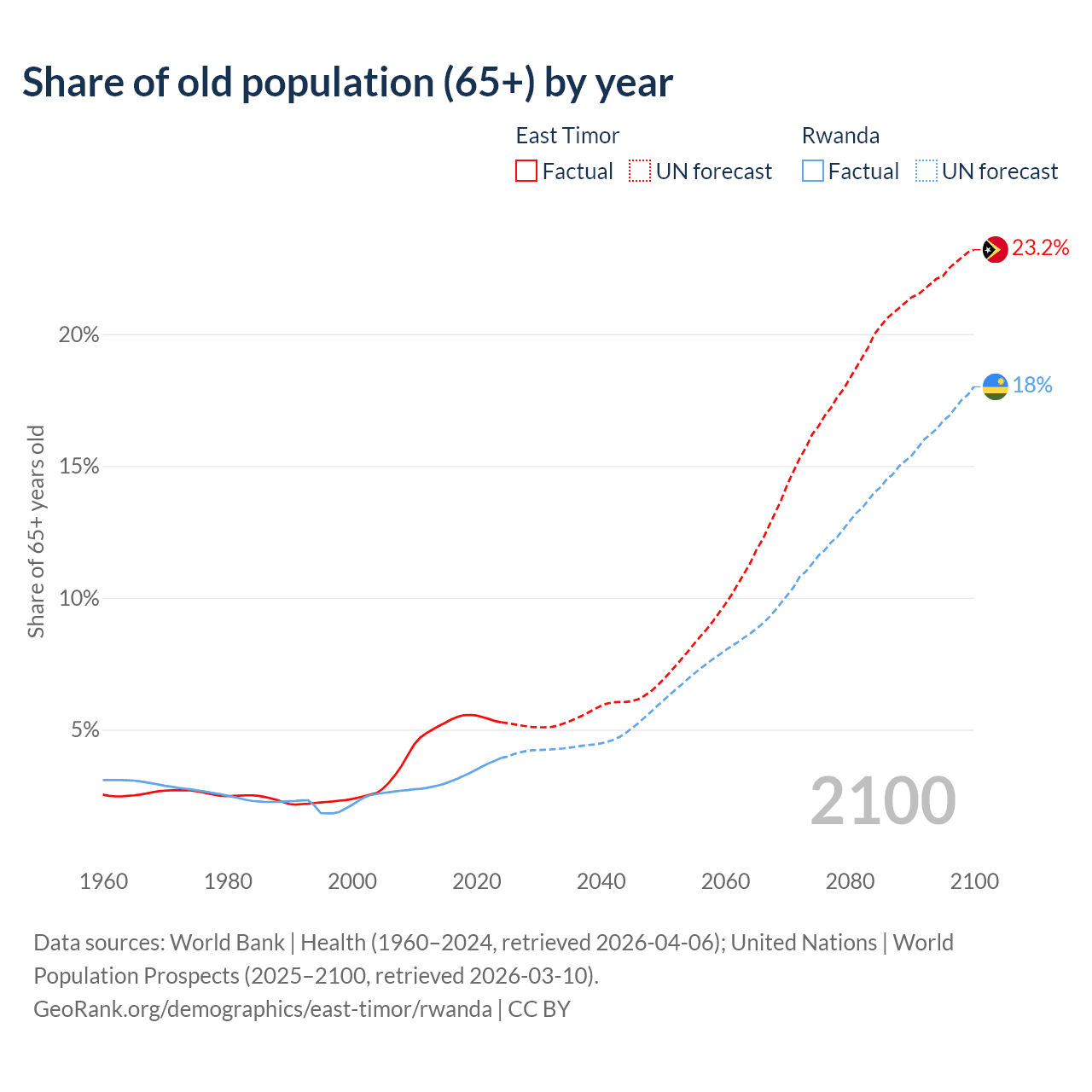 - The share of old-age demographic (65+) in East Timor is 5.28% vs 3.93% in Rwanda.