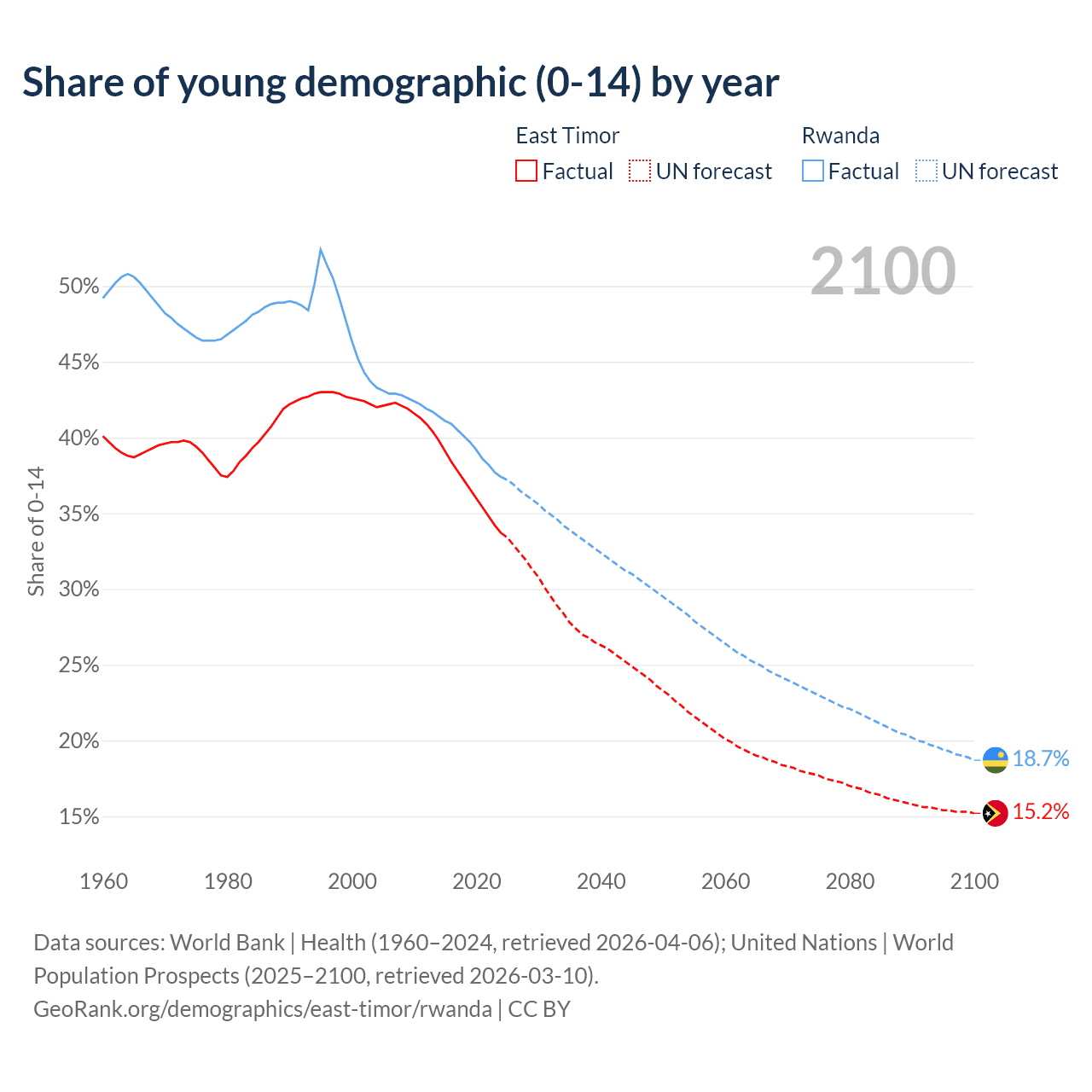 - The share of young demographic (0-15 years old) in East Timor is 33.7% vs 37.4% in Rwanda.
