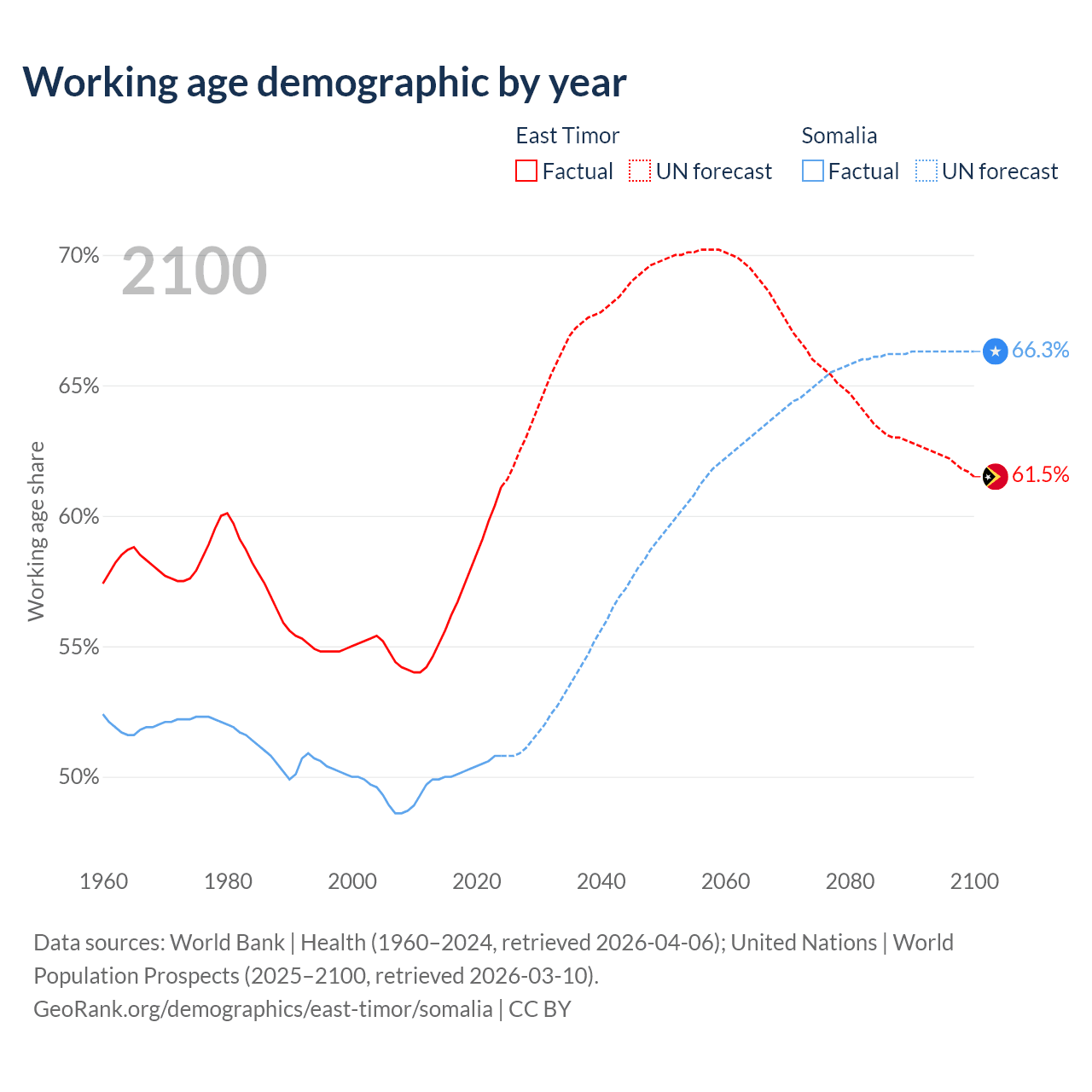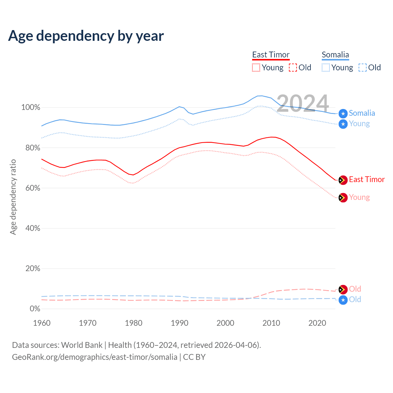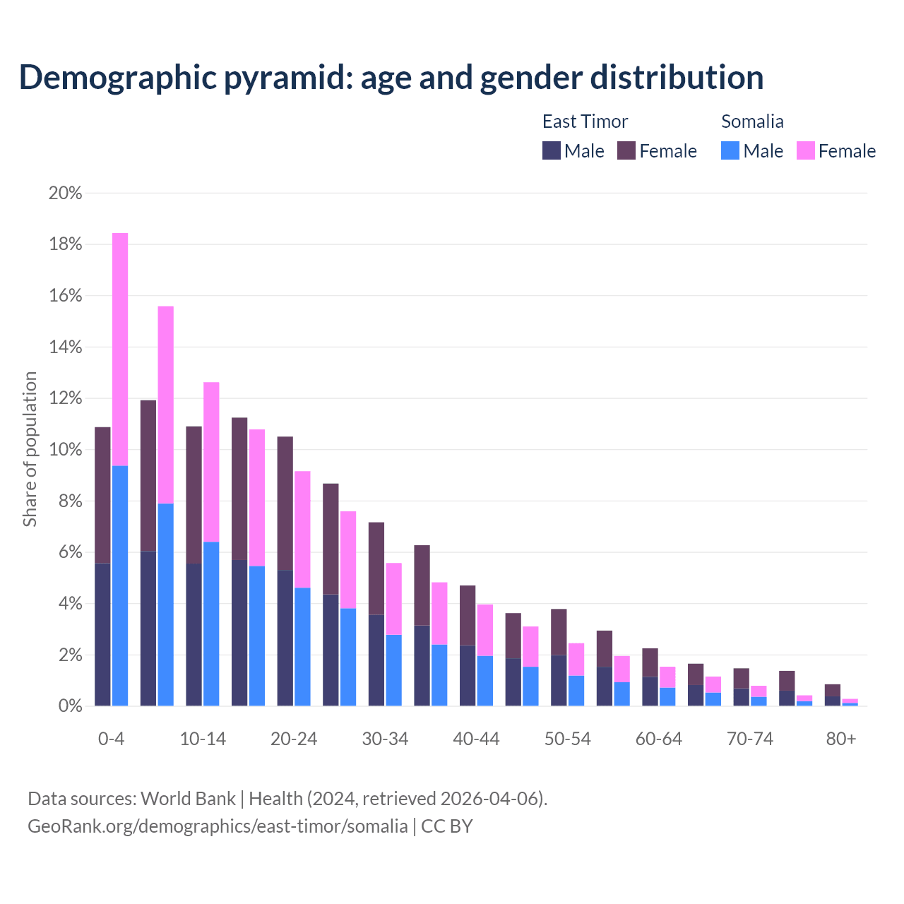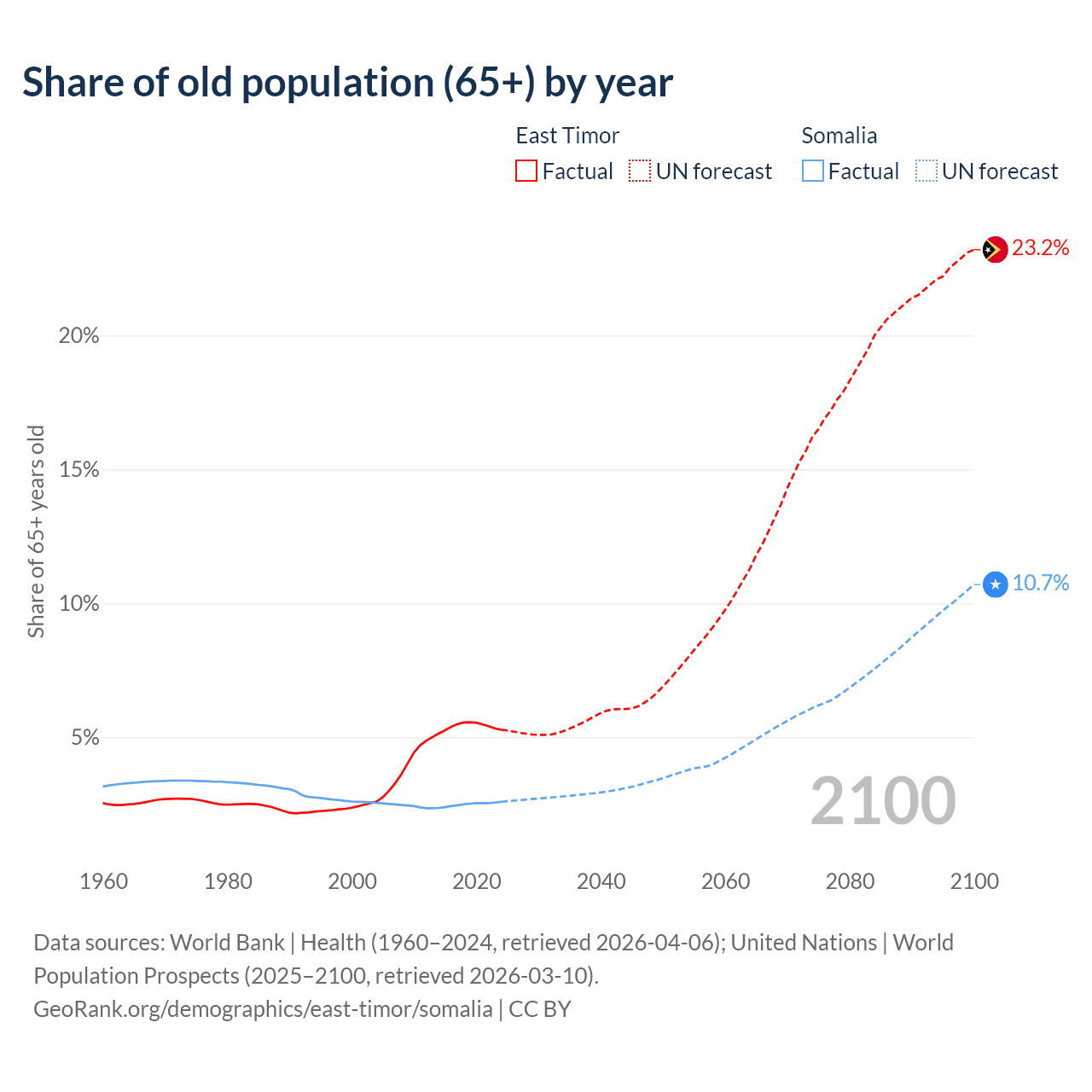 - The share of old-age demographic (65+) in East Timor is 5.28% vs 2.59% in Somalia.