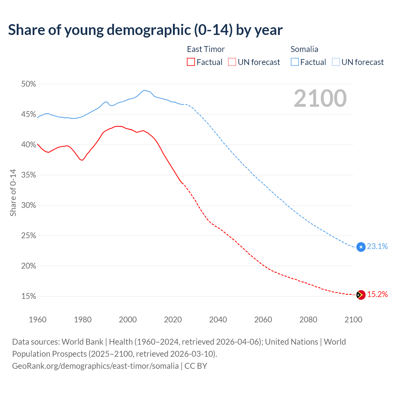 - The share of young demographic (0-15 years old) in East Timor is 33.7% vs 46.6% in Somalia.