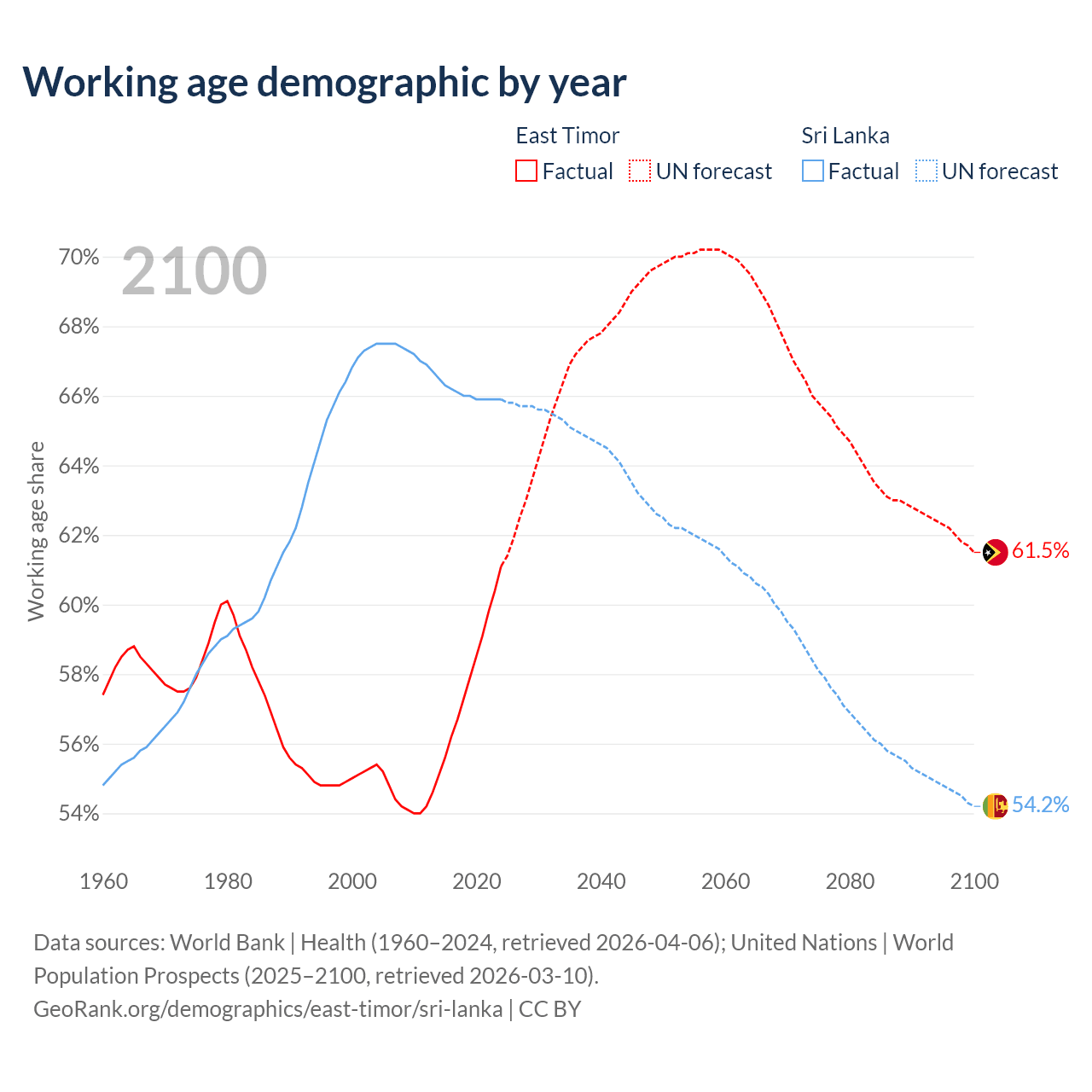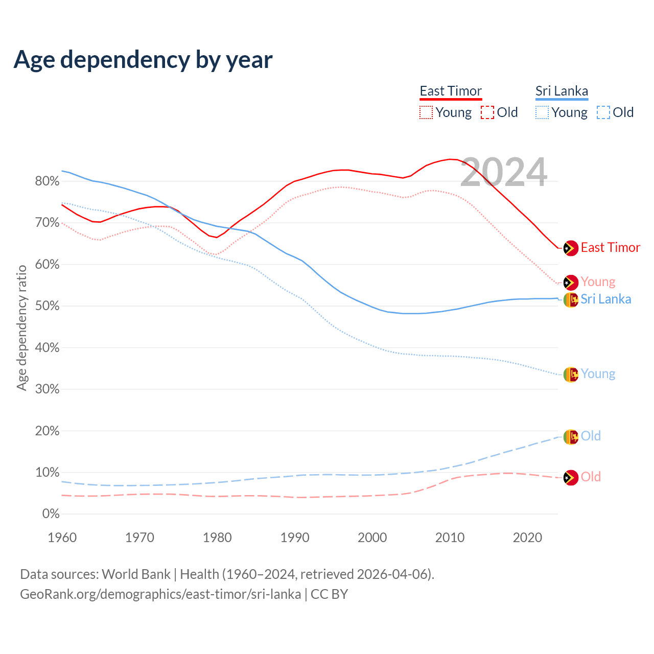 - The share of old-age demographic (65+) in East Timor is 5.28% vs 12.1% in Sri Lanka.