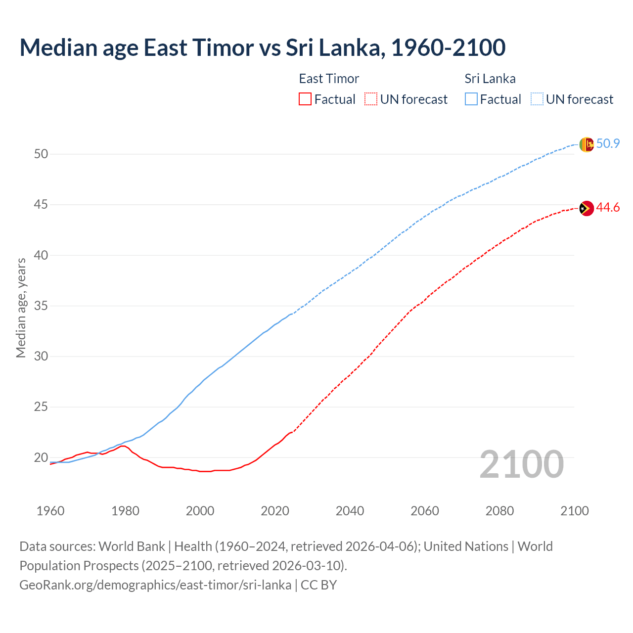 Median age East Timor vs Sri Lanka, 1960-2100