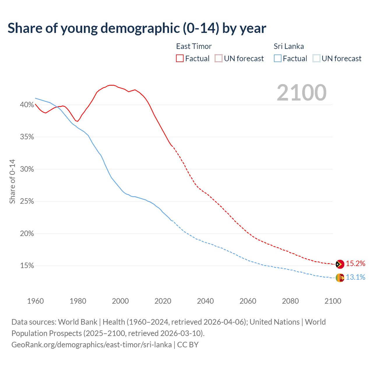 - As of 2026, the population of East Timor is 1.44M vs 22.2M in Sri Lanka - 15.4 times difference.