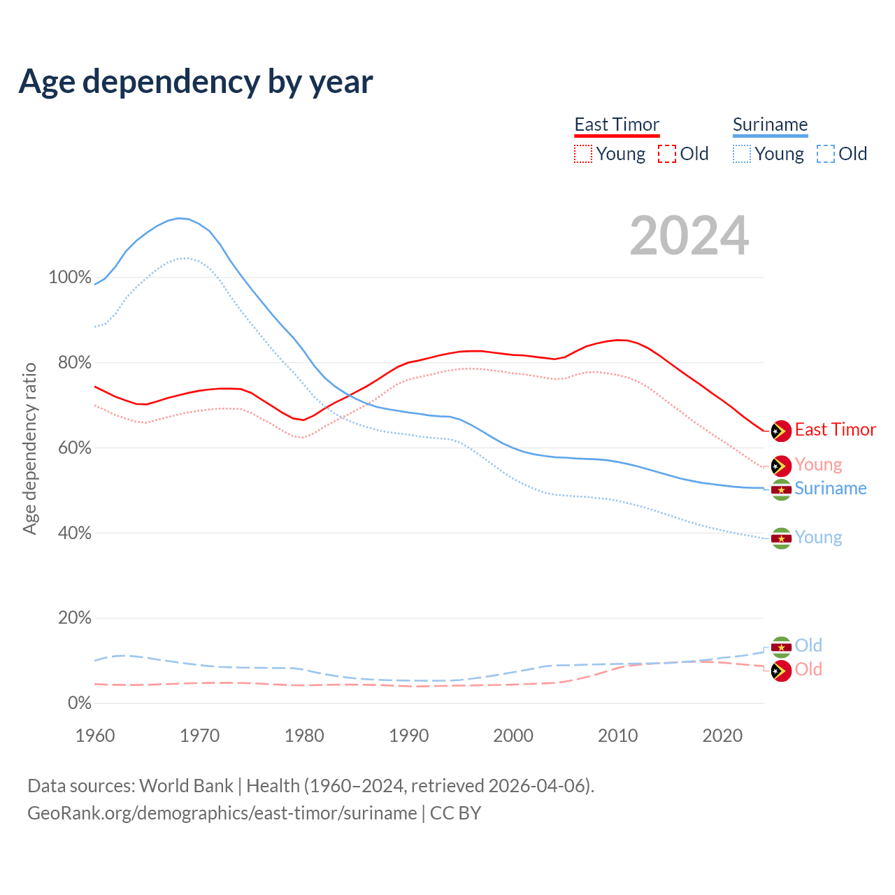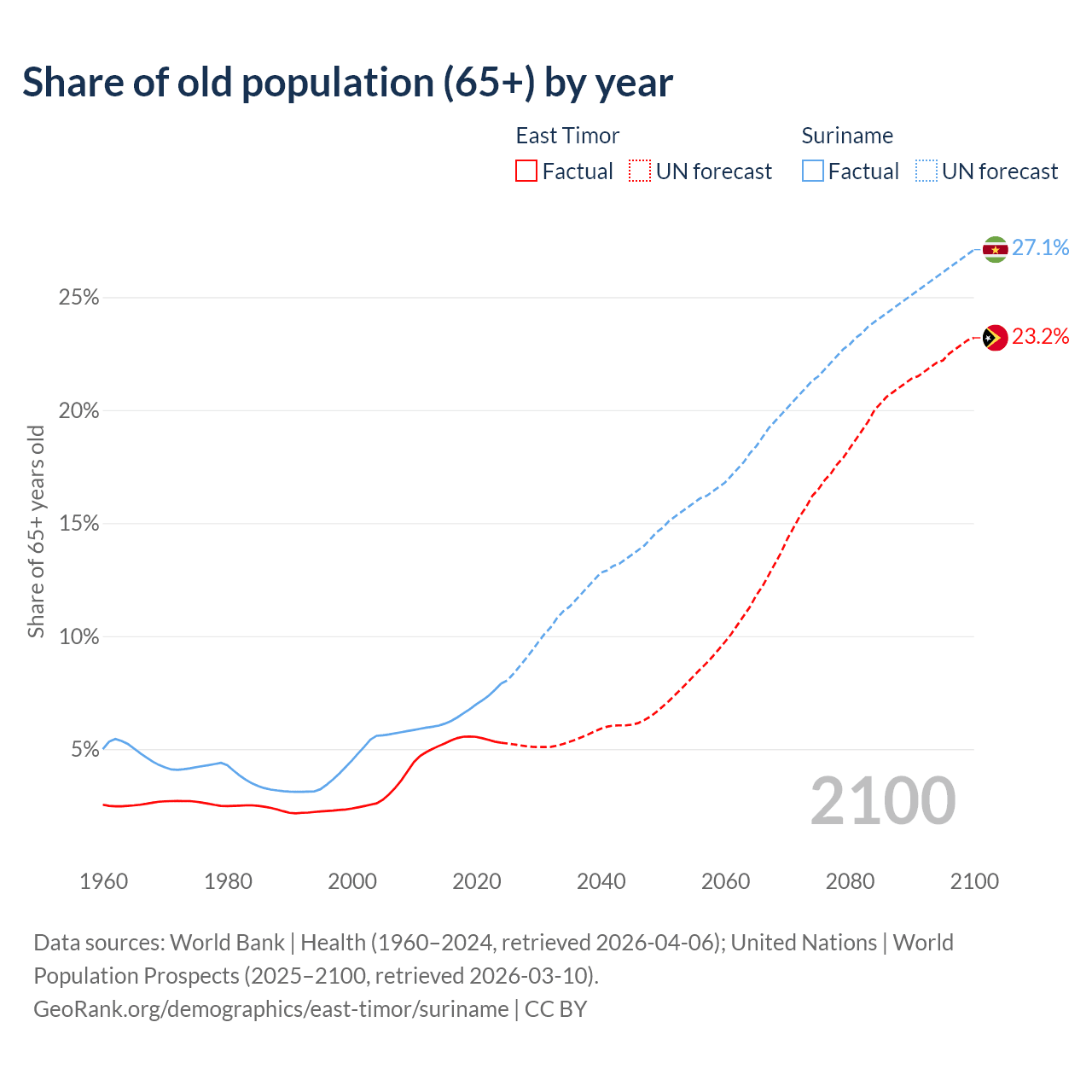 - The share of old-age demographic (65+) in East Timor is 5.28% vs 7.9% in Suriname.