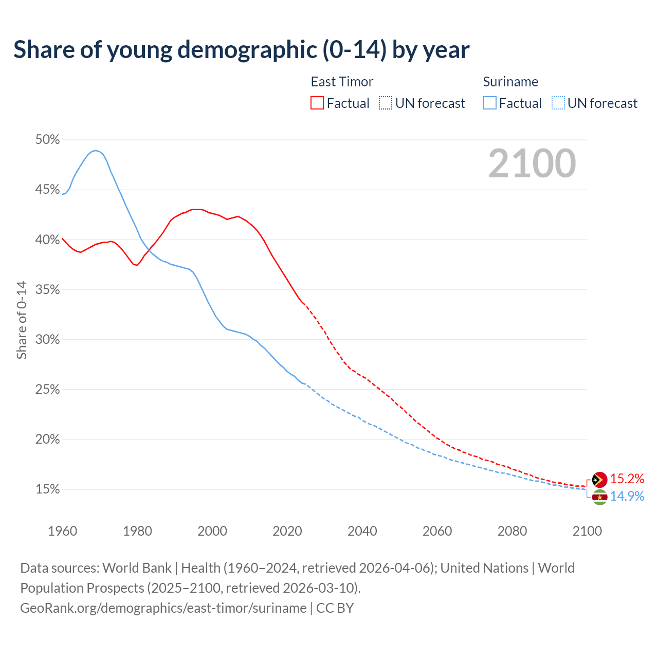 - The share of young demographic (0-15 years old) in East Timor is 33.7% vs 25.6% in Suriname.