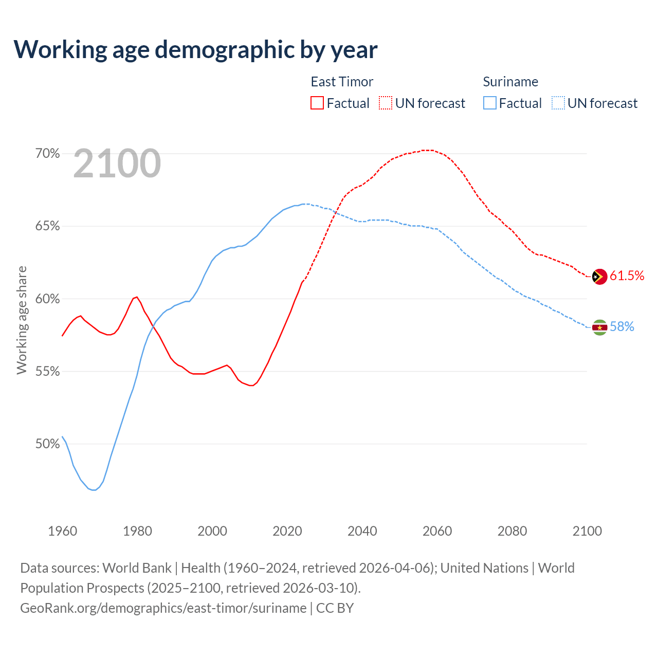 - East Timor has 880K working age adults (aged 15-64) vs 430K in Suriname.