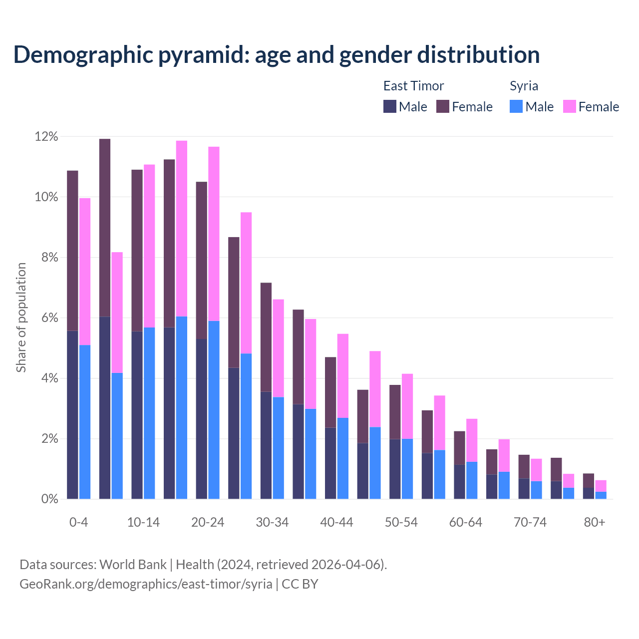 - The share of old-age demographic (65+) in East Timor is 5.28% vs 4.74% in Syria.