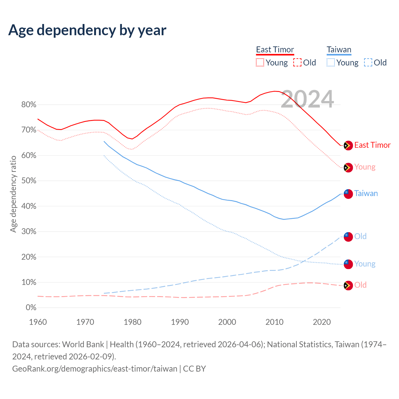 - East Timor is ranked 145/196 by median age (oldest to youngest) vs 16/196 for Taiwan.