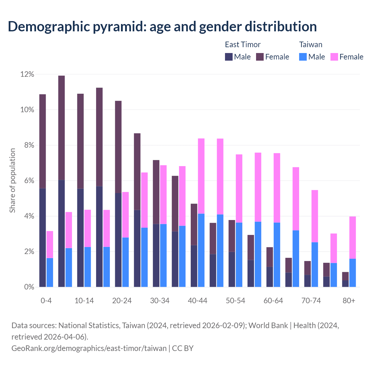 - As of 2026, the population of East Timor is 1.44M vs 23.2M in Taiwan - 16.1 times difference.