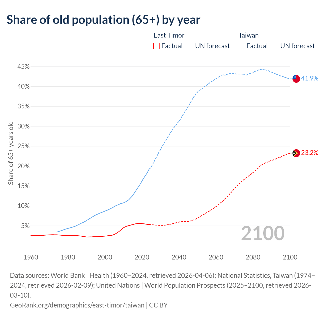 The share of older people aged 65 and over is 5.28% in East Timor and 19.2% in Taiwan. Life expectancy in East Timor compared to Taiwan .