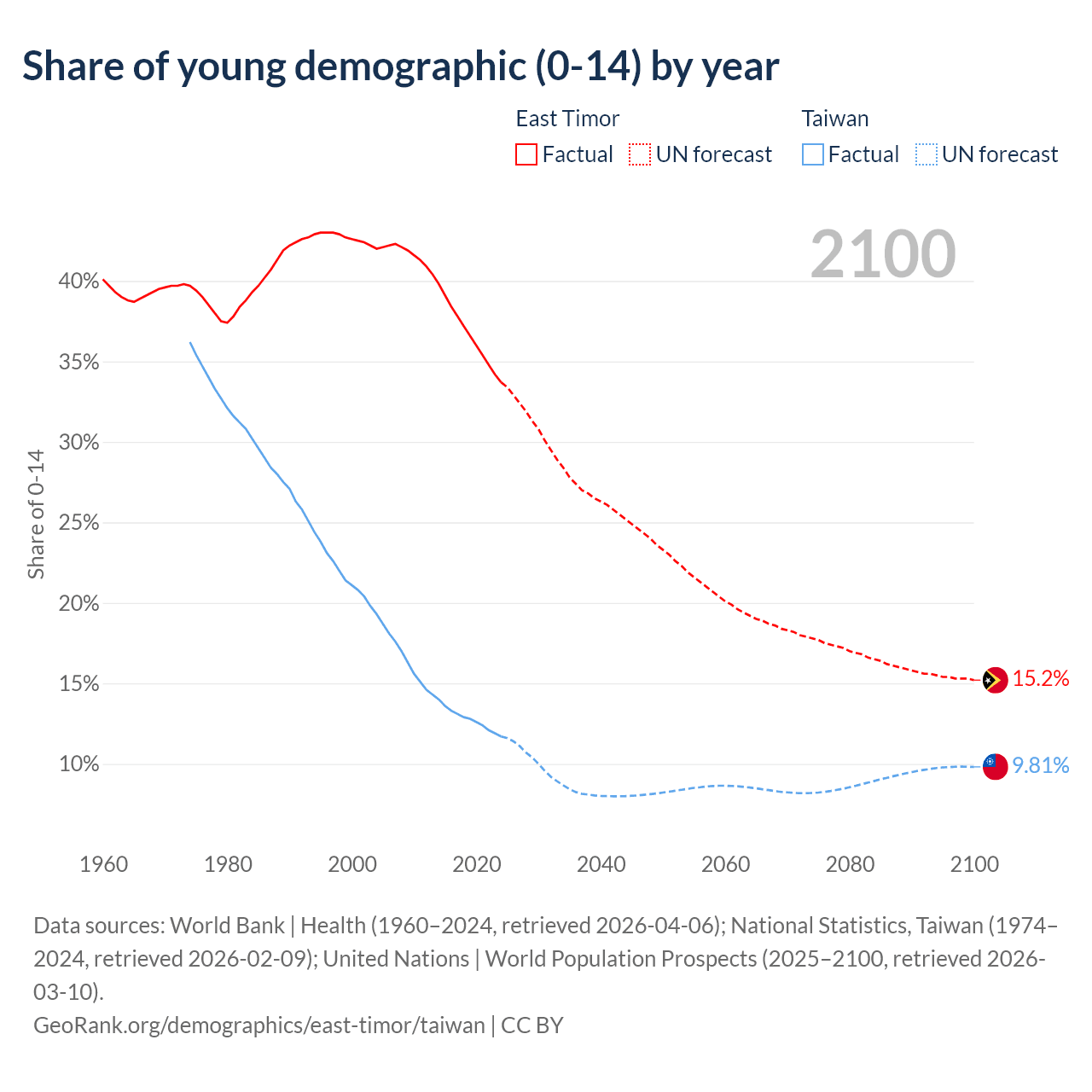 - The share of young demographic (0-15 years old) in East Timor is 33.7% vs 11.7% in Taiwan.