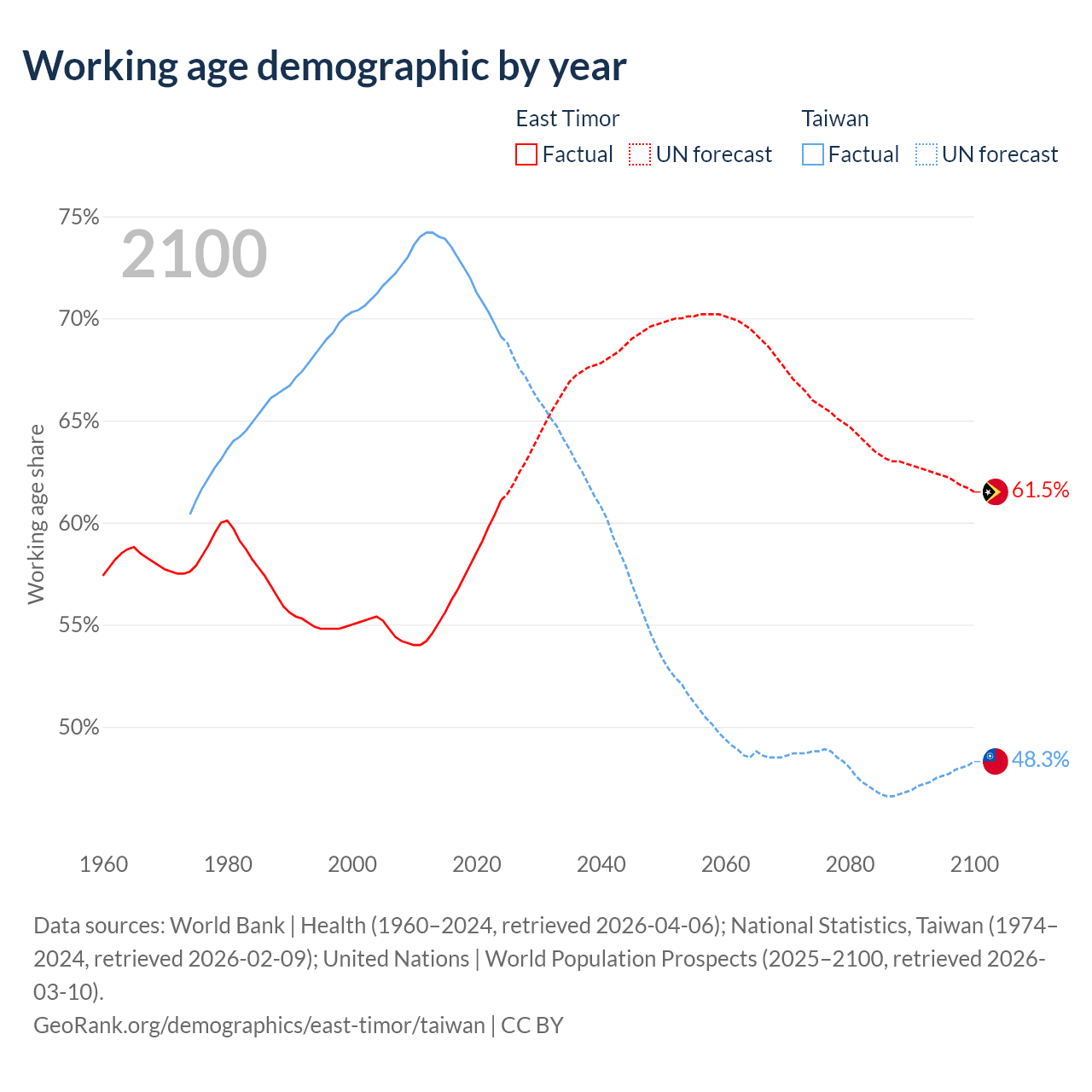 - East Timor has 880K working age adults (aged 15-64) vs 16.1M in Taiwan.