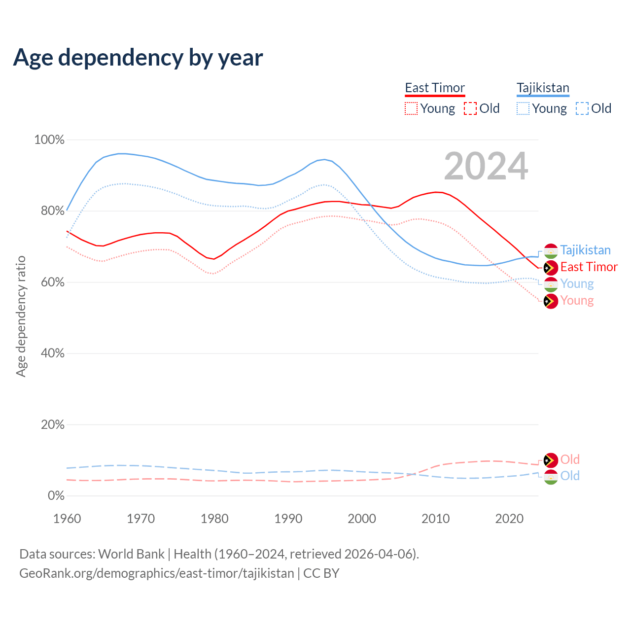 - The share of old-age demographic (65+) in East Timor is 5.28% vs 3.85% in Tajikistan.
