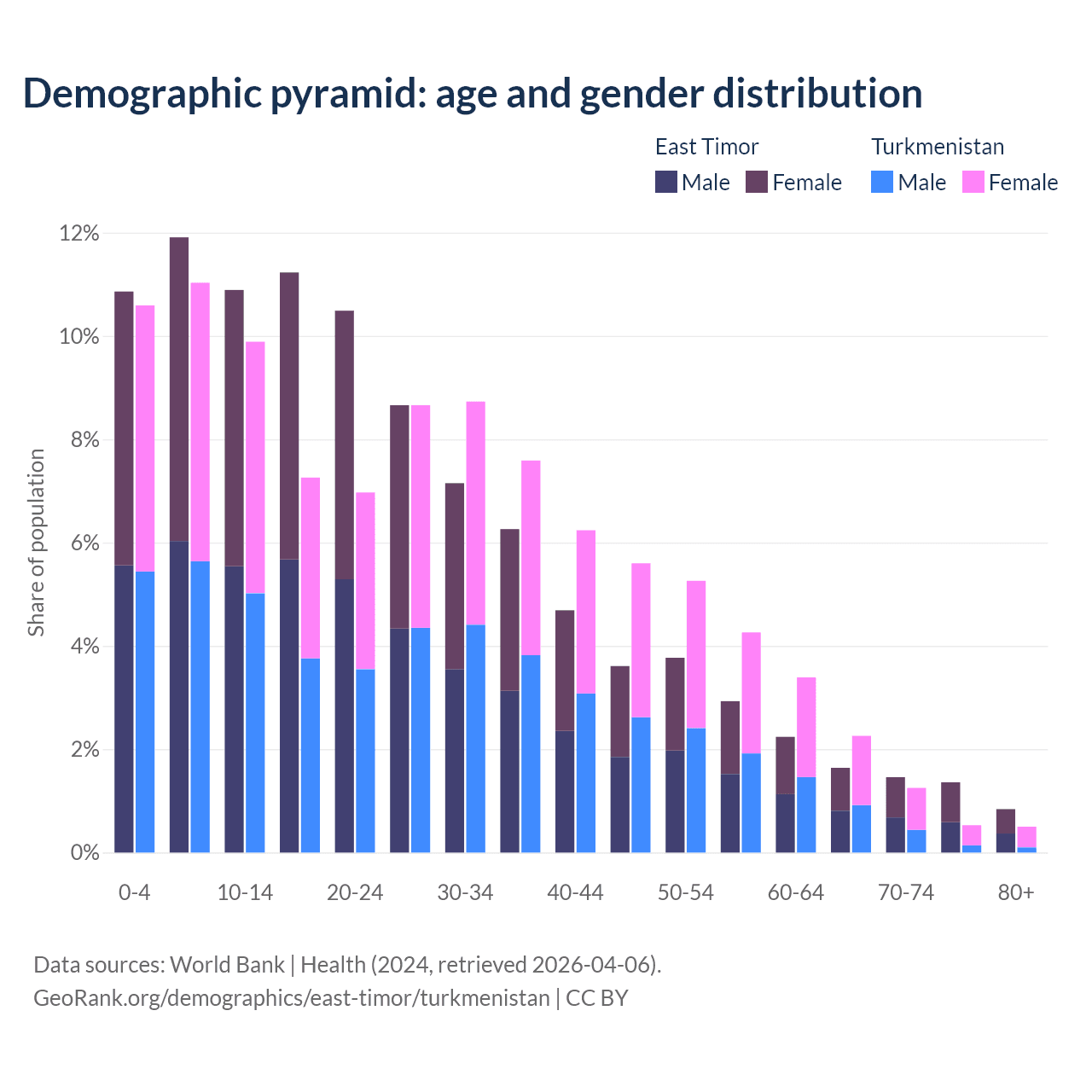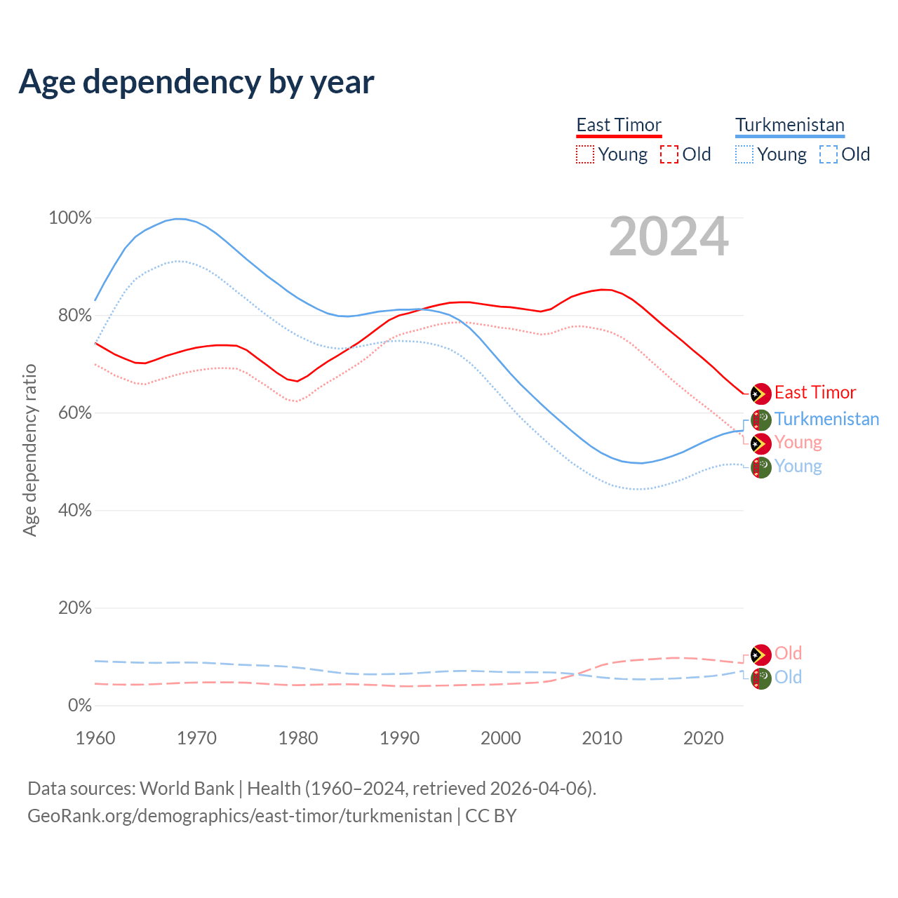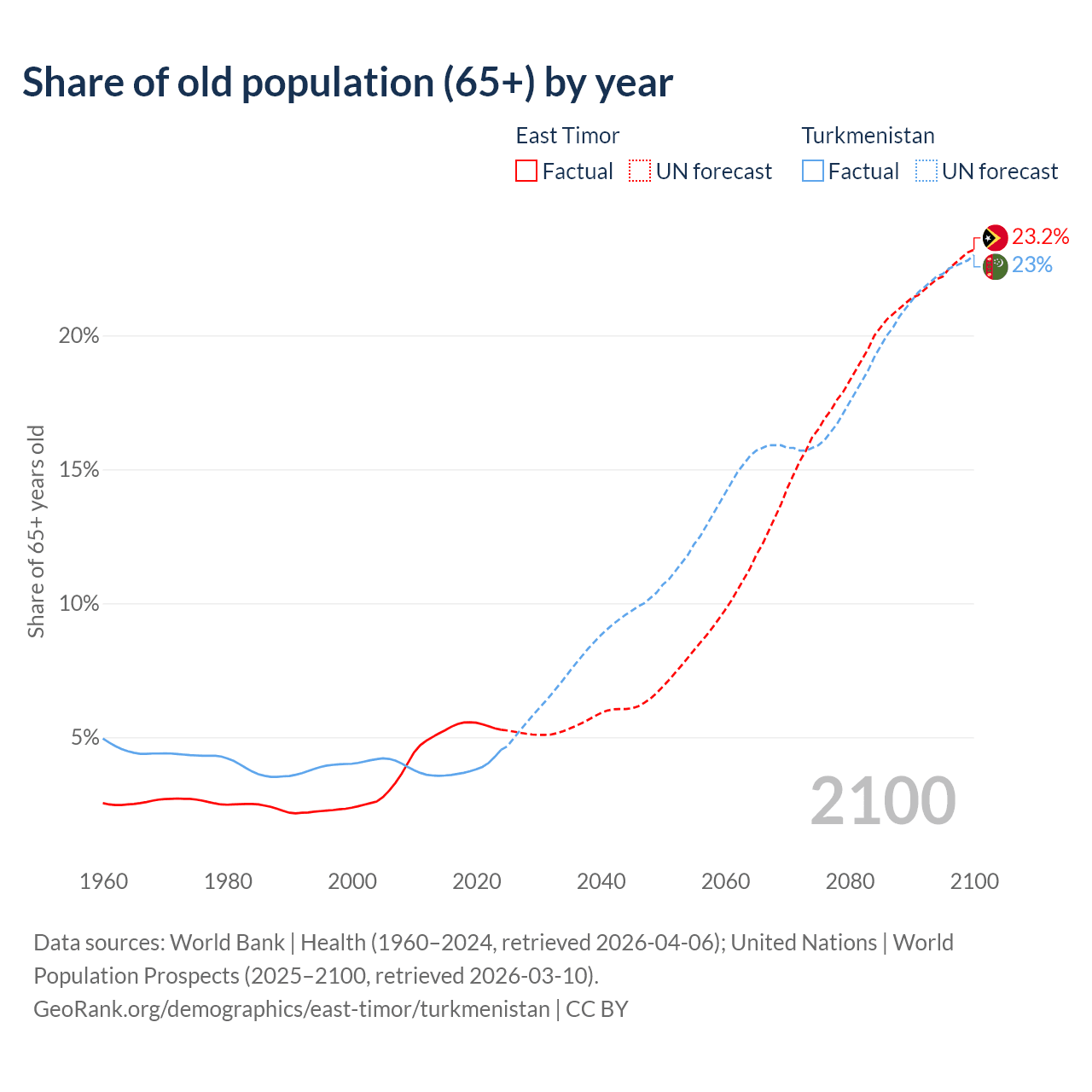 - The share of old-age demographic (65+) in East Timor is 5.28% vs 4.53% in Turkmenistan.