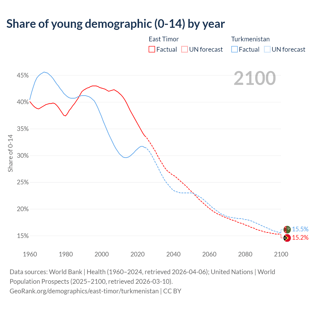- The share of young demographic (0-15 years old) in East Timor is 33.7% vs 31.5% in Turkmenistan.
