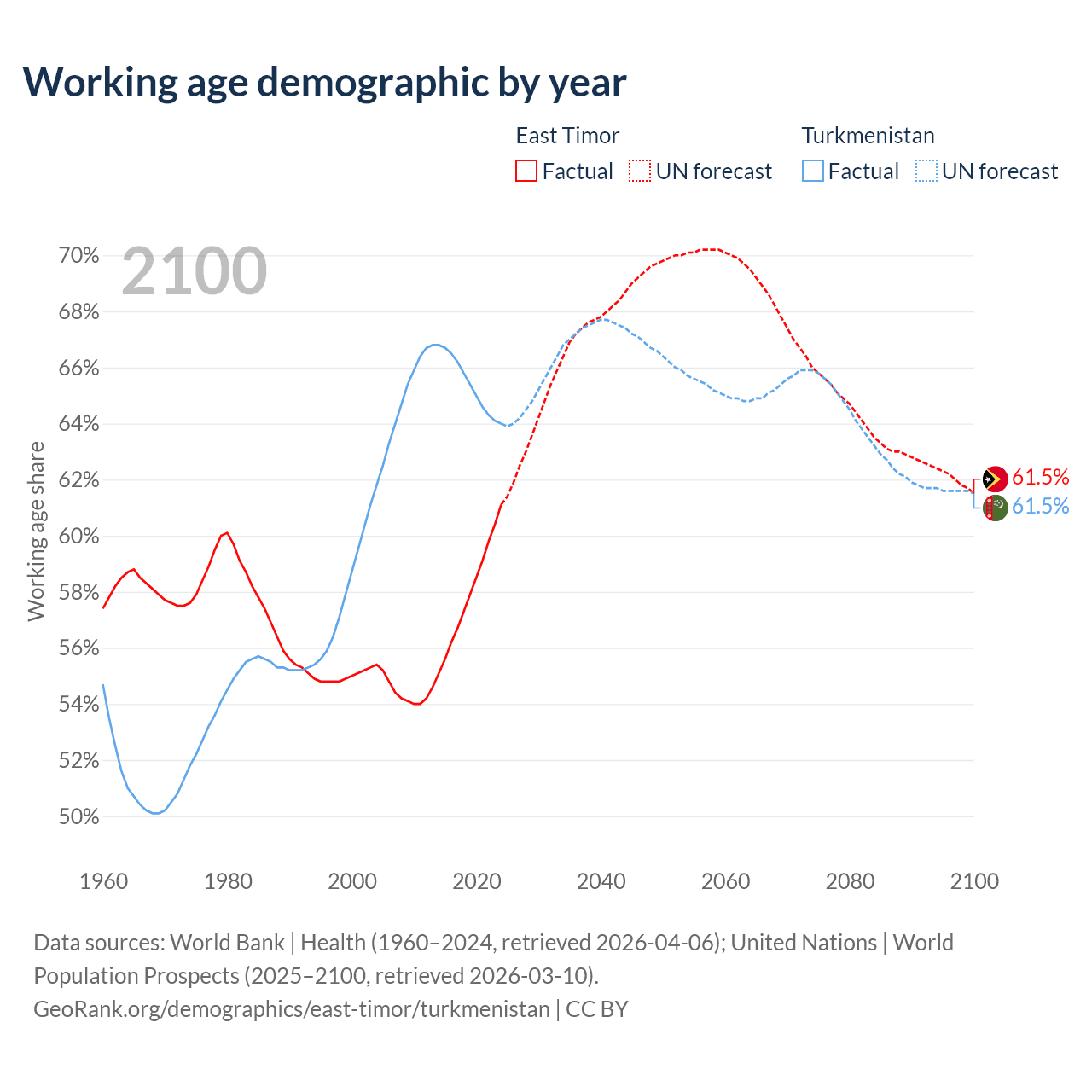 - East Timor has 880K working age adults (aged 15-64) vs 4.97M in Turkmenistan.