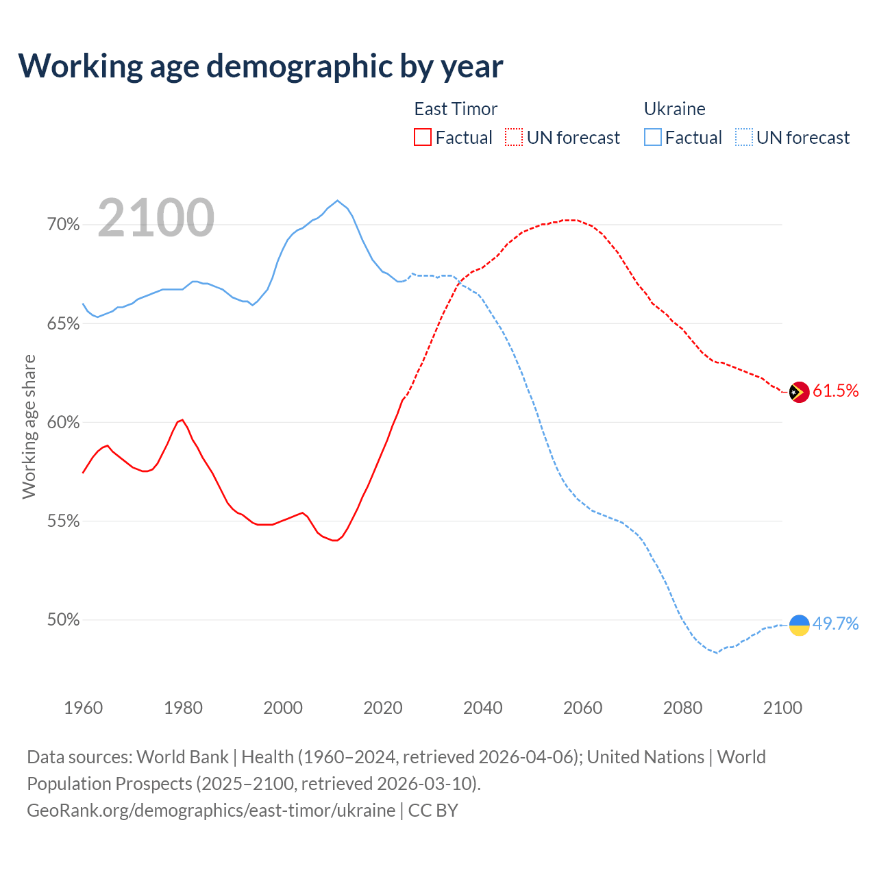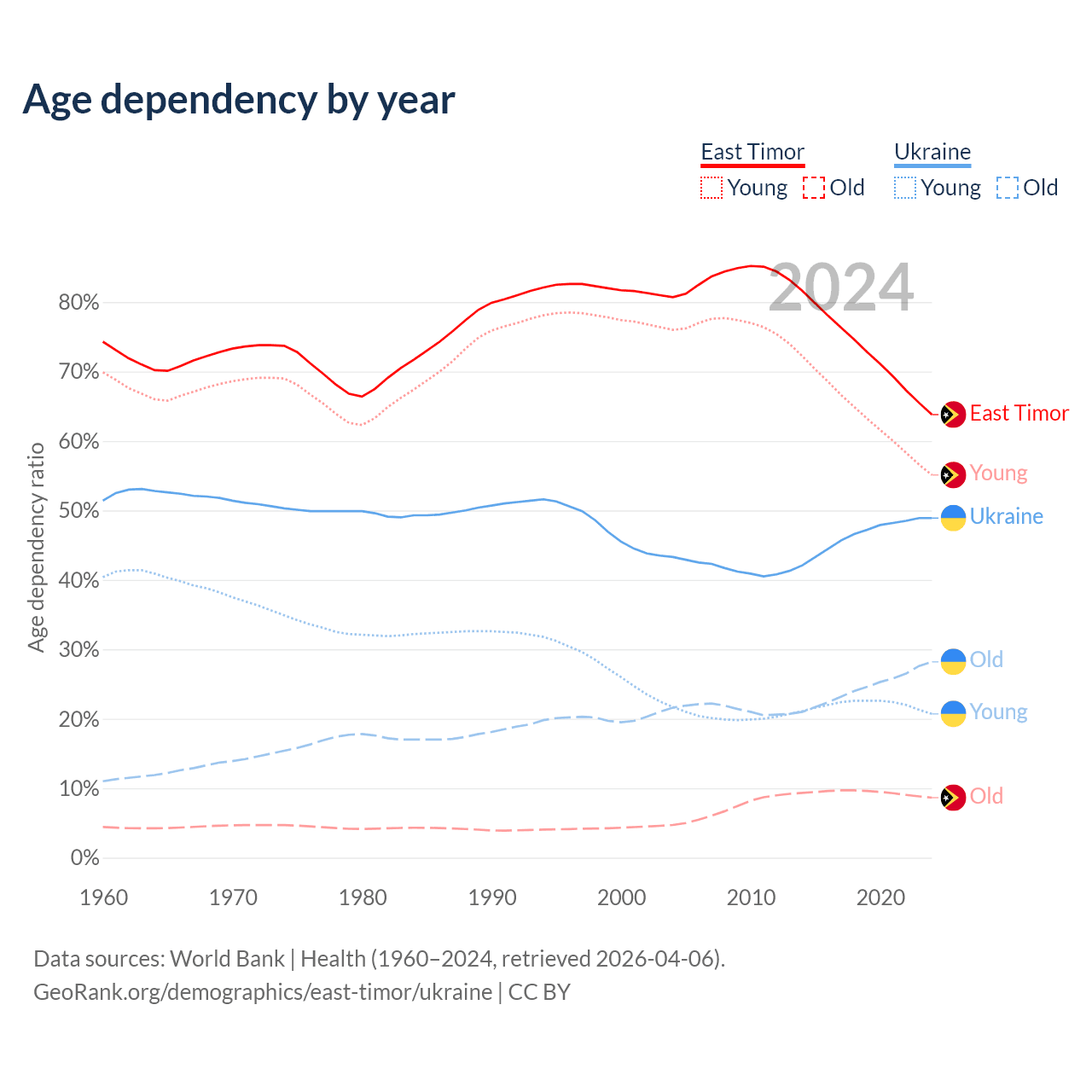 - The share of old-age demographic (65+) in East Timor is 5.28% vs 19% in Ukraine.