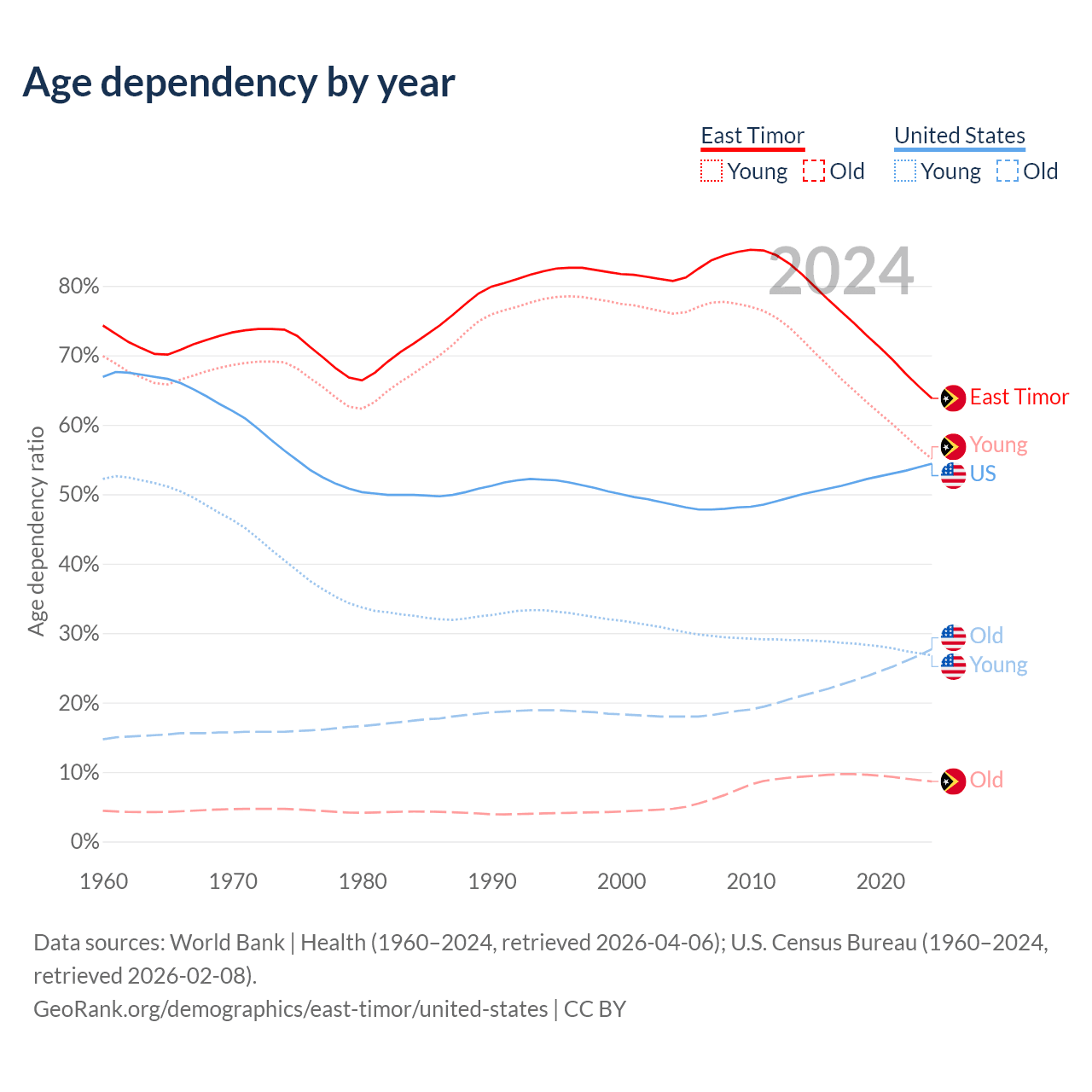 - The share of old-age demographic (65+) in East Timor is 5.28% vs 17.9% in the United States.