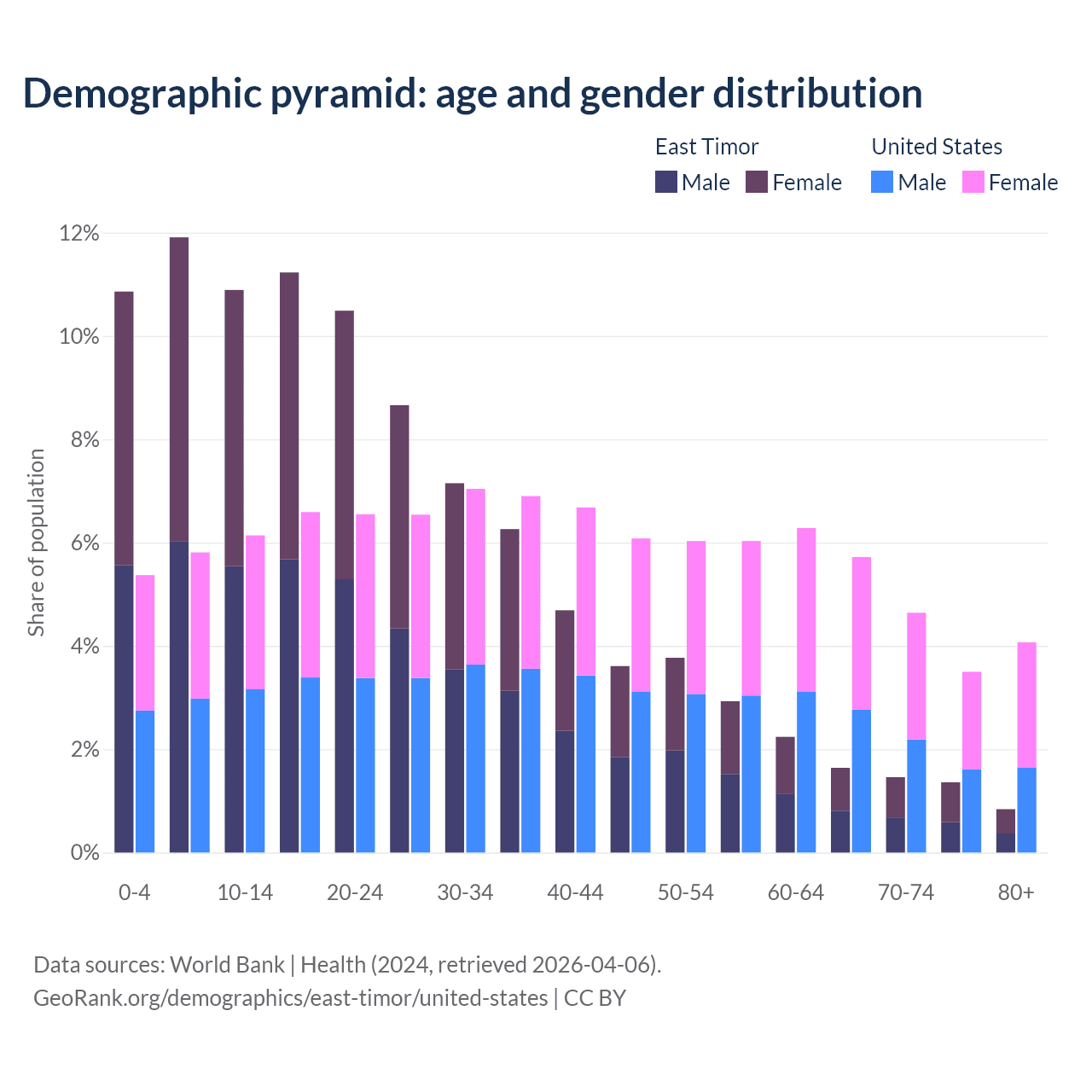 The share of older people aged 65 and over is 5.28% in East Timor and 17.9% in the United States. Life expectancy in East Timor compared to the United States .